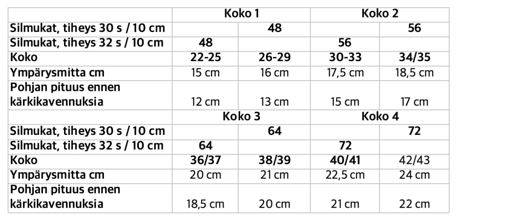 Tiheys 30 tai 32 s = 10 cm sileää neuletta 2,25 – 2,5 mm tai tarvittaessa muun kokoisilla puikoilla, jotta pääset tavoiteltuun neuletiheyteen.