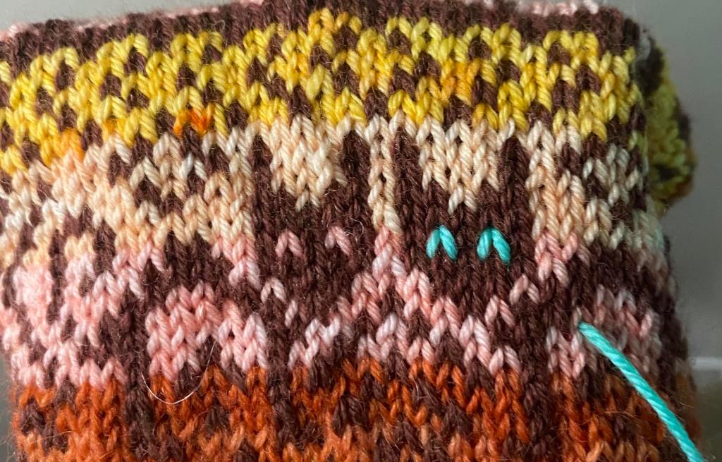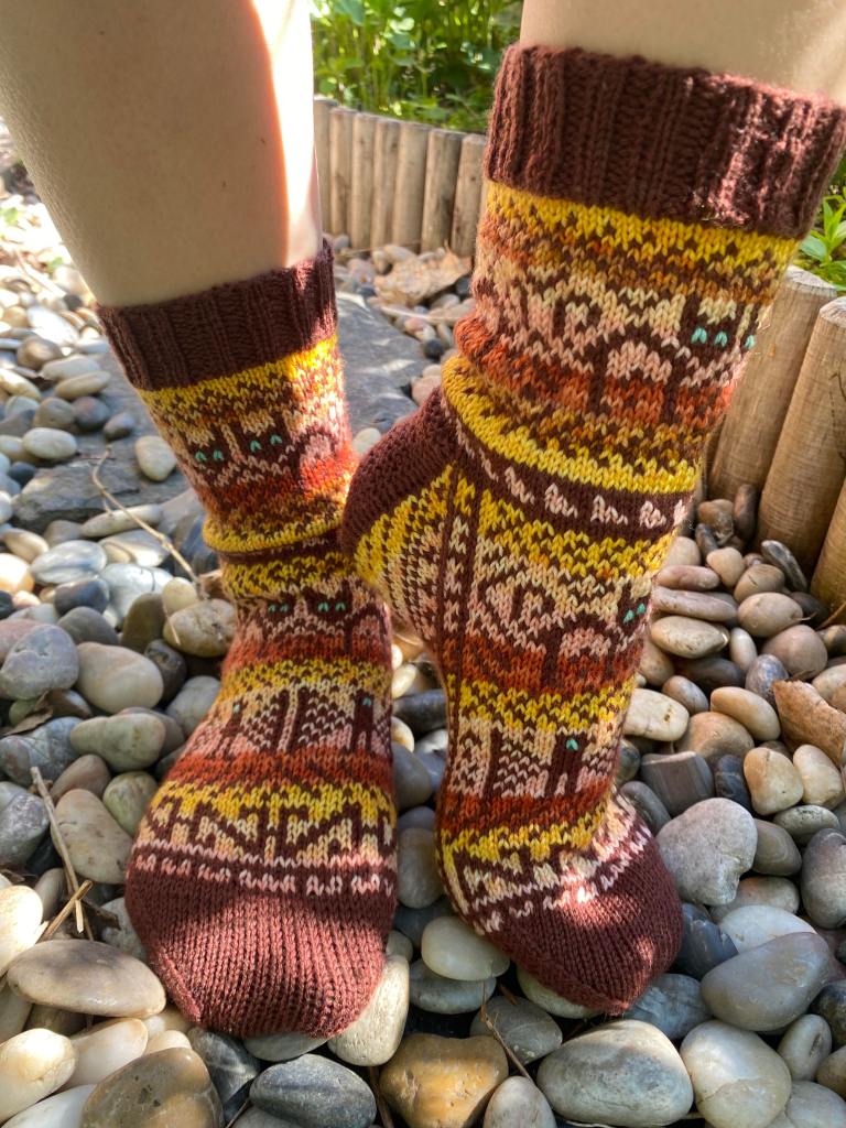 Inkasukkien suunnittelu lähti liikkeelle googlen inkahaun kautta. Tykästyin heti kissa- ja lintukuvioihin ja halusin ne jollain tavalla sukkiin. Koska sukissa on ohuellakin langalla tehtynä melko vähän silmukoita, jouduin modifioimaan kissahahmon omiin silmukkamääriin sopivaksi. Taustalangoiksi valitsin ensin seitikkivärjätyn jämän ja siihen sopivia persikan ja keltaisen sävyjä. Kuviot tulisivat luonnollisesti tummanruskealla. Kuviolanka tuttuun tapaan Hobbiin Unicornia, taustavärit itse värjättyjä jämiä.