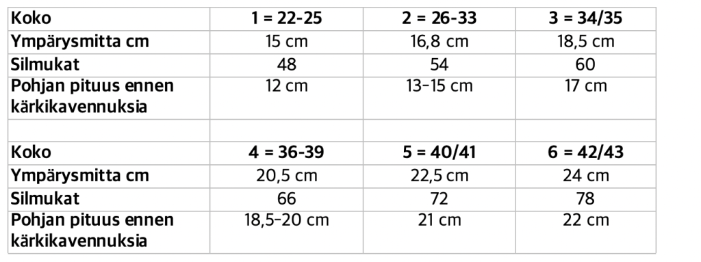 Koko Ohjeessa on kuusi kokoa 1, 2, (3, 4), 5, 6) Katso tarkemmat mitat alla olevasta taulukosta, Taulukko 1.