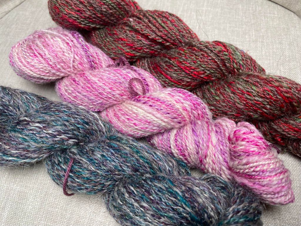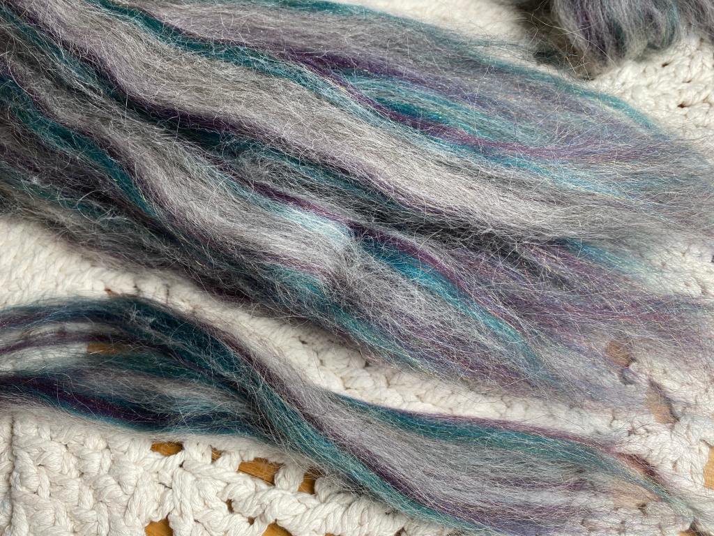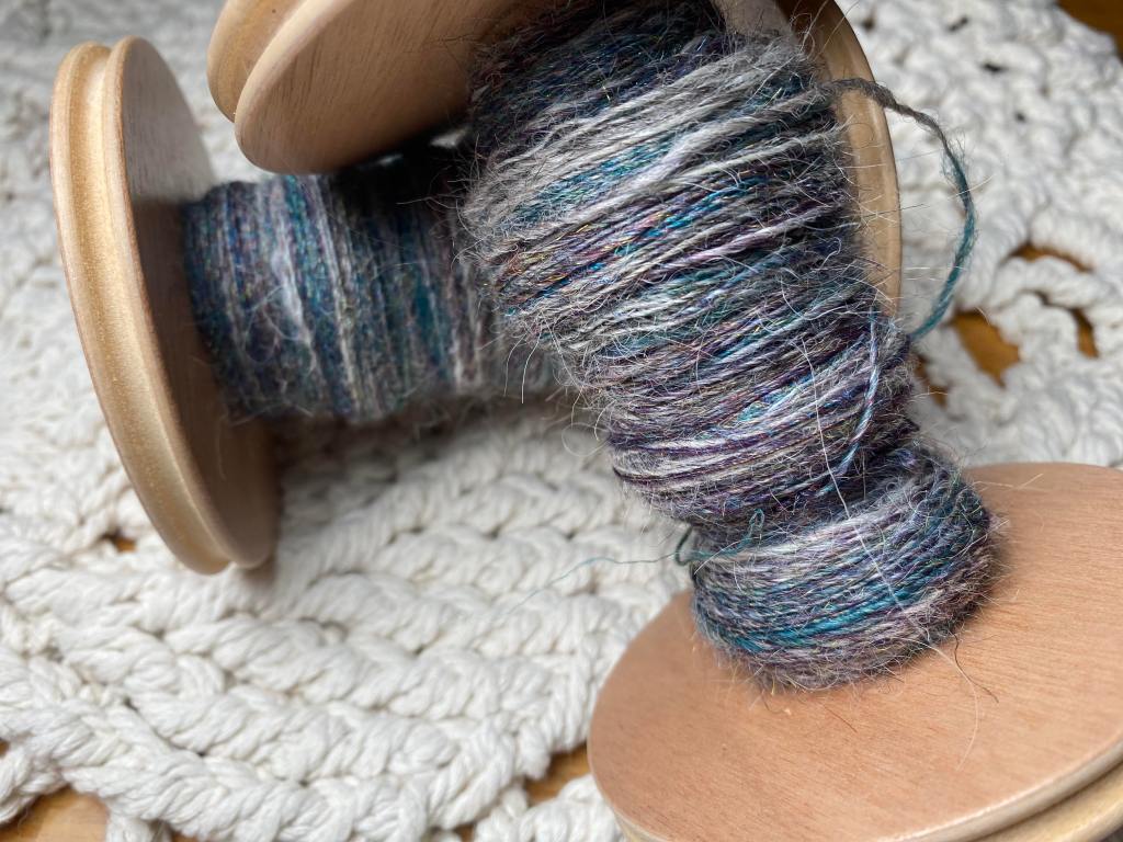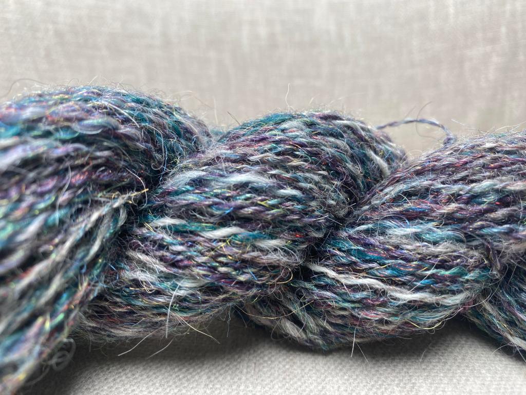 Valmis lanka on läheltä katsottuna hennosti kimaltelevaa ja siinä on hienoja sinisen, vihreän ja lilan sävyjä vaalean karvan seassa.