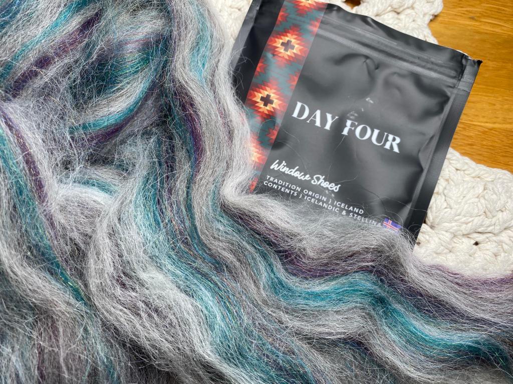 Päivä 4 traditio on Islannista ja Window Shoes. Islannissa lapset laittavat kengän ikkunalaudalle ja jos he ovat olleet kilttejä, kengässä on pieni lahja. Tuhmille lapsille kenkään ilmestyy mätä peruna. Pussista tuli islantilaista villaa ja stellinaa. Villassa on kolmea väriä, ruskeaa, vihreää ja vaalean harmaata.