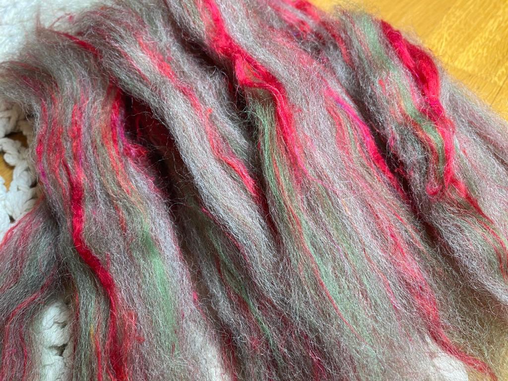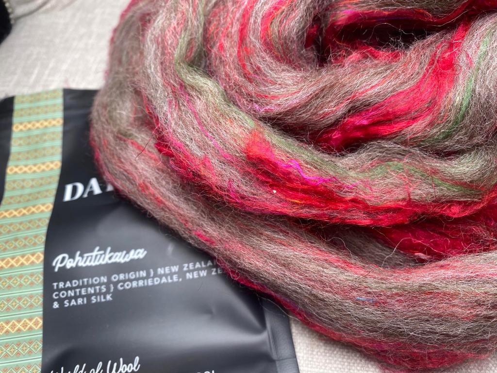 Päivän luukusta tuli omituisen vihertävänkukertava topsi, ensimmäinen ajatus oli värioksennus. Päivän teemana on New Zeland ja traditiona ”Pohutukawa”, joka on niin sanotusti punavihreä joulupuu. Topseista tullut kehräystulos on yllättänyt minut jo niin monesti, että annan tällekin erikoisen väriselle topsille mahdollisuuden. Lopputulos muistuttaa jostain syystä istukkaa, mutta lanka ei ole läheskään niin pahan näköinen kuin pelkäsin.