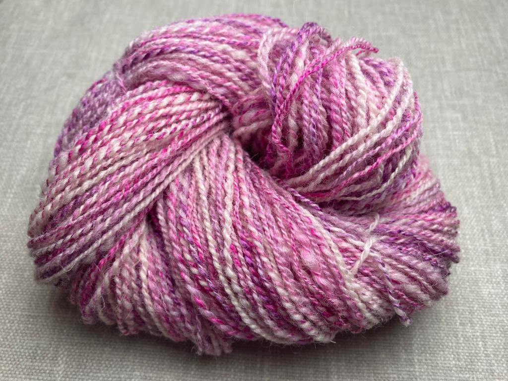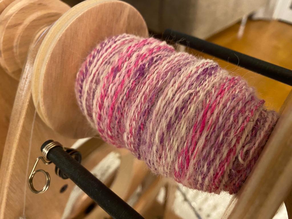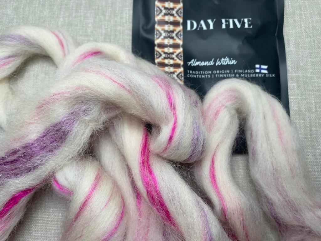 Päivä viisi edusti Suomea ja traditiona ”Almond Within”. Ajattelin heti, että pussista tulisi valkoista, mutta yllätyin iloisesti, kun suomenlampaan villan seassa oli ihanaa fuksian ja lilan väristä mulberry silkkiä. Seos oli jälleen mukavan leppoisaa työstettävää ja lanka valmistui illan aikana. Valmis lanka on ihanan vaaleanpunervaa.