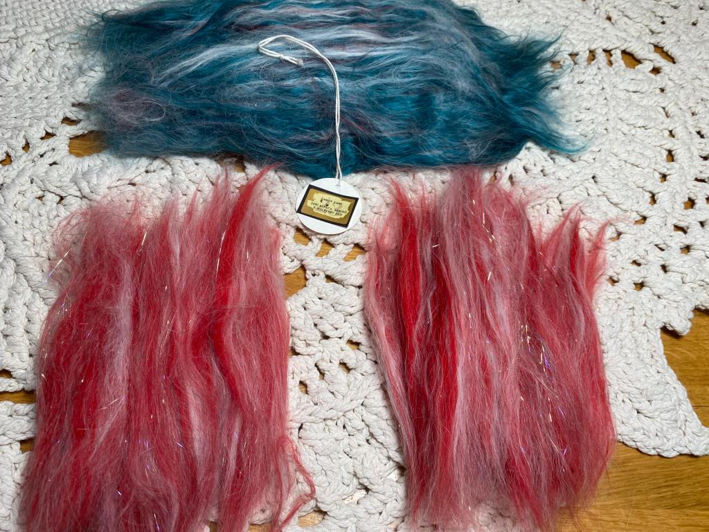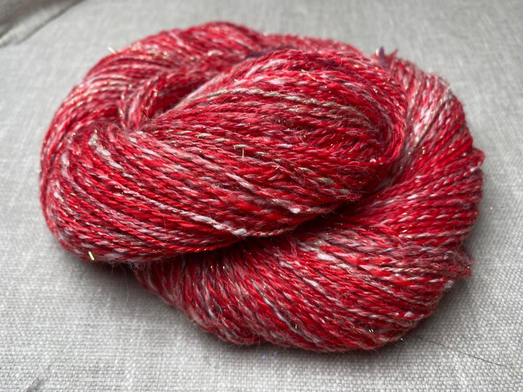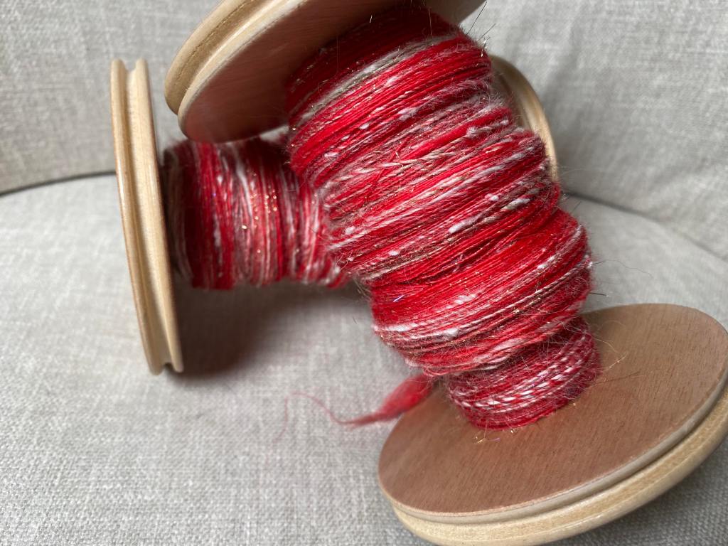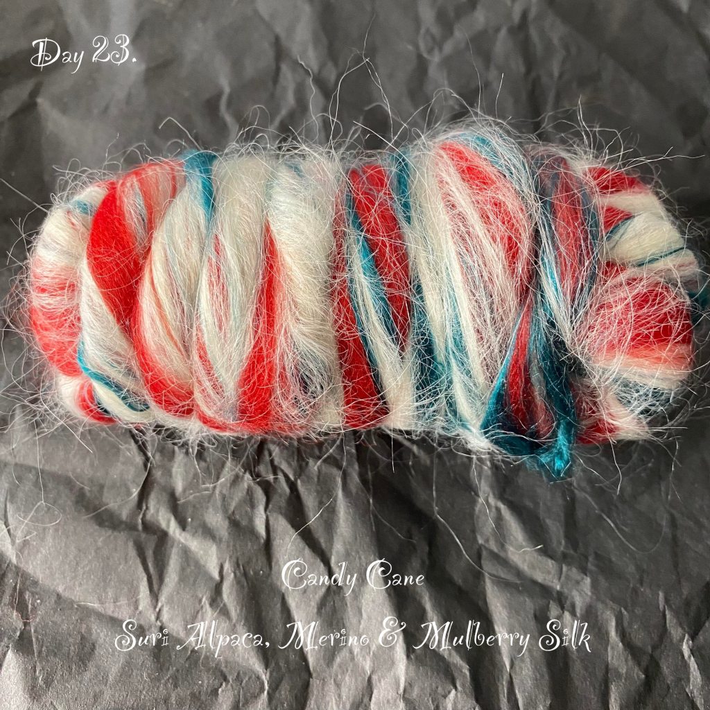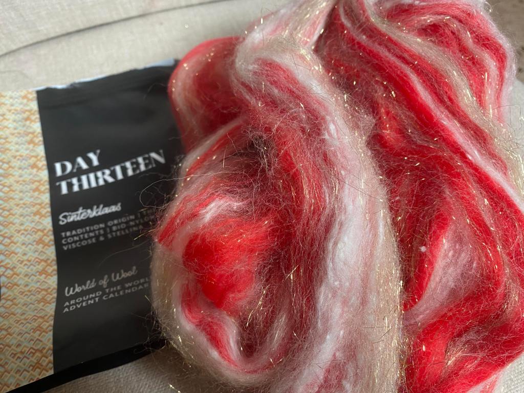 Kolmannestatoista pussukasta tuli Alankomaiden Sinterklaas perinteen innoittama punavalkea topsi, jossa oli runsaasti kultaista stellinaa seassa. Topsi on bio-nylonia, villaa, viskoosia ja stellinaa. Lisäsin sekaan viimevuoden joulukalenterin luukun 23 topsista irroiteltua punaista ja valkoista kuitua. Valkoinen on alpakkaa ja punainen todennäköisesti merinoa. Lopuksi lisäsin vielä hiukan kultaista stellinaa lisäkarvojen sekaan. Alarivin kuvassa viimevuoden topsi erottelun jälkeen. Molempia värejä tuli noin 25 g. Sain siis valmista lankaa noin 75 g ja 200 m.