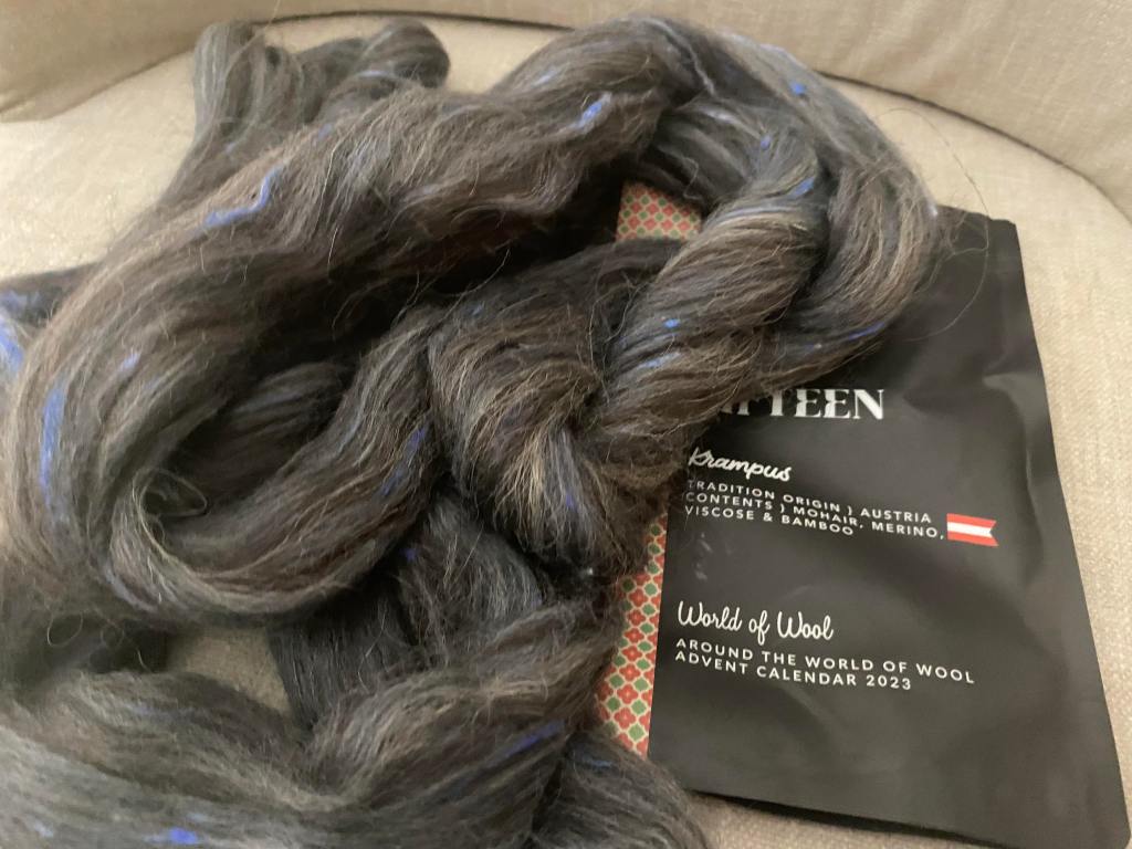 Itävallan Krampus teeman innoittamana tuli kaunista harmaata villaa, jossa on aavistus sinistä seassa. Topsin sekoitus on: mohair, merino, viskoosi ja bambu. Tämän jätän odottamaan mahdollista kaveria.