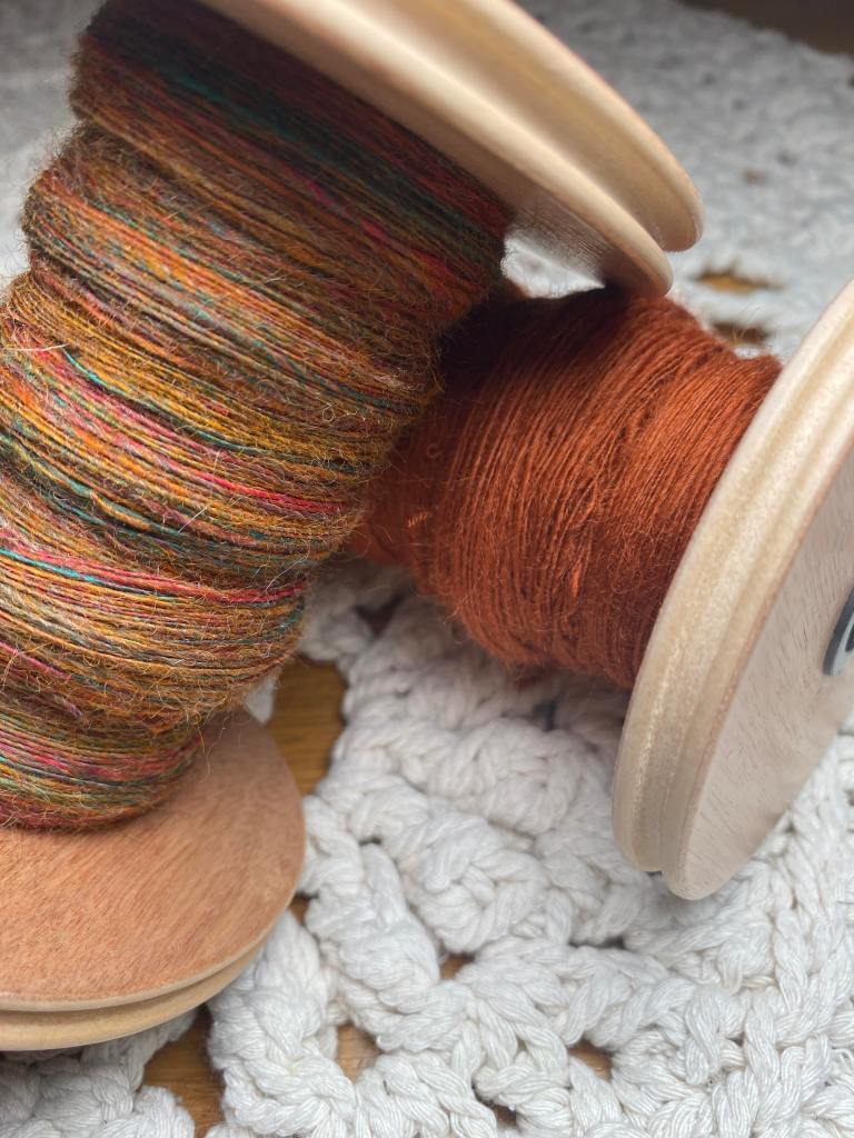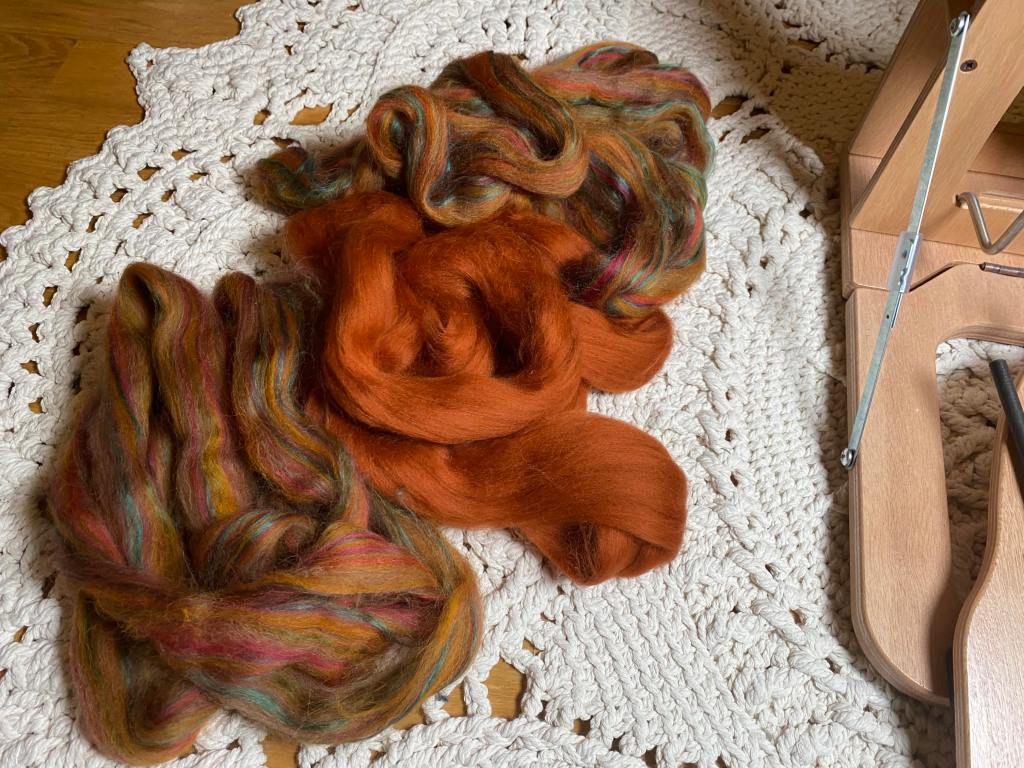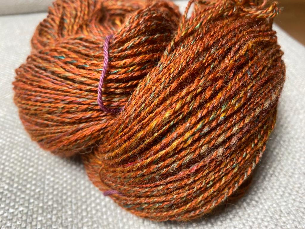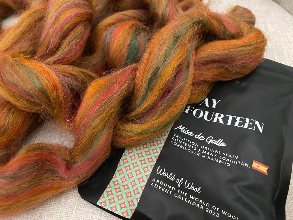 Teemana oli Espanjalainen Misa de Gallo. Pussissa ollut villa oli lämpimän oranssia ja sen seassa oli mausteisia punaisia ja vihreää. En ole oranssin ja vihreän yhdistelmän ystävä, mutta kuidut olivat niin sekaisin, ettei vihreää saanut järkevästi eroteltua. Minulla oli samaa poltetun oranssin väristä corriedalea, joten kehräsin luukun villan yhdeksi säikeeksi ja sille oranssin säikeen kaveriksi. Näin valmiille langalle tuli selkeästi oranssi väri ja vihreä pilkahtelee satunnaisesti. Lanka on kuin maahan pudonneet lehdet ruskan aikaan. Olen kehrännyt kalenterin ansiosta enemmän kuin koskaan, ja se alkaa näkyä käsialassa. Säikeet eivät enää katkeile kerrattaessa ja lanka on kaikin puolin tasalaatuista. Alkuperäinen topsi sisältää: Manx Loaghatan, corriedale ja bambu. Valmista lankaa tuli noin 290 m.