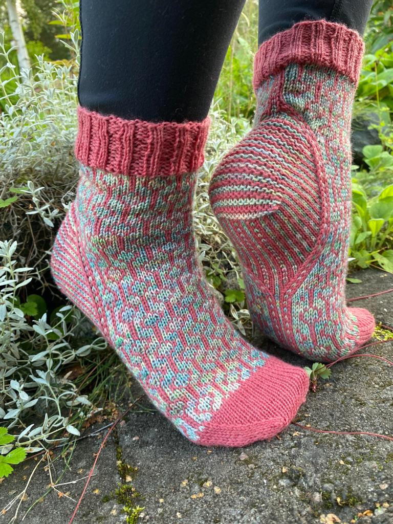 Kantapää on rajattu Gucci-sukkien tapaan, mutta tällä kertaa vein muotoilun pohjan puolella loppuun asti. Kuvioraidan kavennuksilla ja lisäyksillä kantapää asettuu todella napakasti paikoilleen ja sukat tuntuvat kivan istuvilta jalassa.