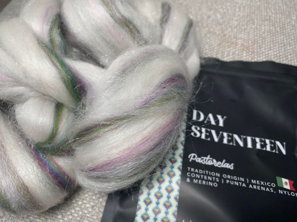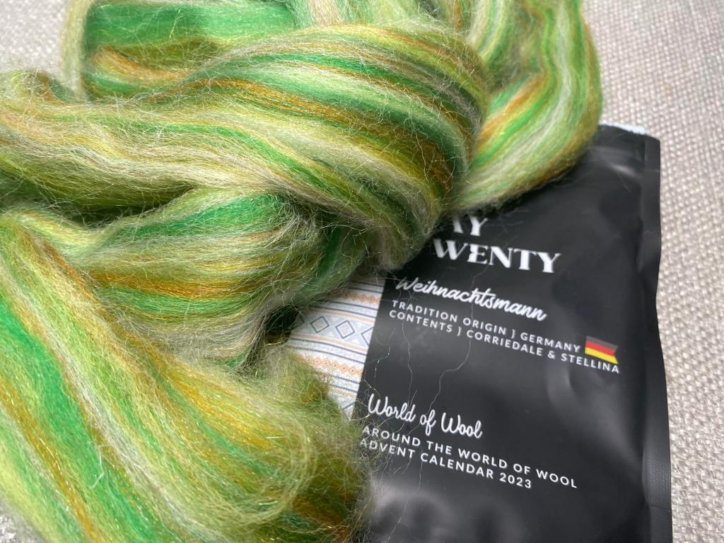 Kahdennestakymmenennestä pussukasta löytyi Kellertävän vihreää corriedalen ja stellinan seosta. Tämä tulee olemaan ihanaa kehrättävää. Päivän teemana oli Sakasalainen Weihnachtsmann, eli joulupukki.