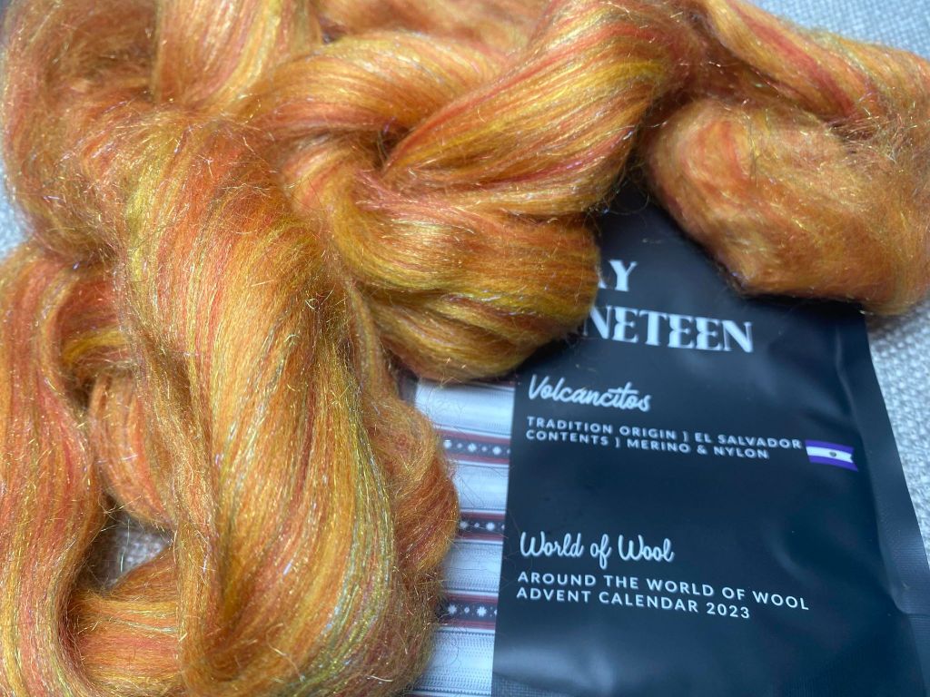 Päivän pussista tuli aivan ihanan herkullisen hedelmäisen värinen topsi. Raikkaan keltaoranssia merinon ja nylonin sekoitetta. Tähän voisi sekoittaa jotain muuta, jotta saisin valmista lankaa vähän enemmän. Päivän traditio on El Salvadorin Volcancitos, joka liittyy ilmeisesti maan tuliperäisyyteen ja tuleen.