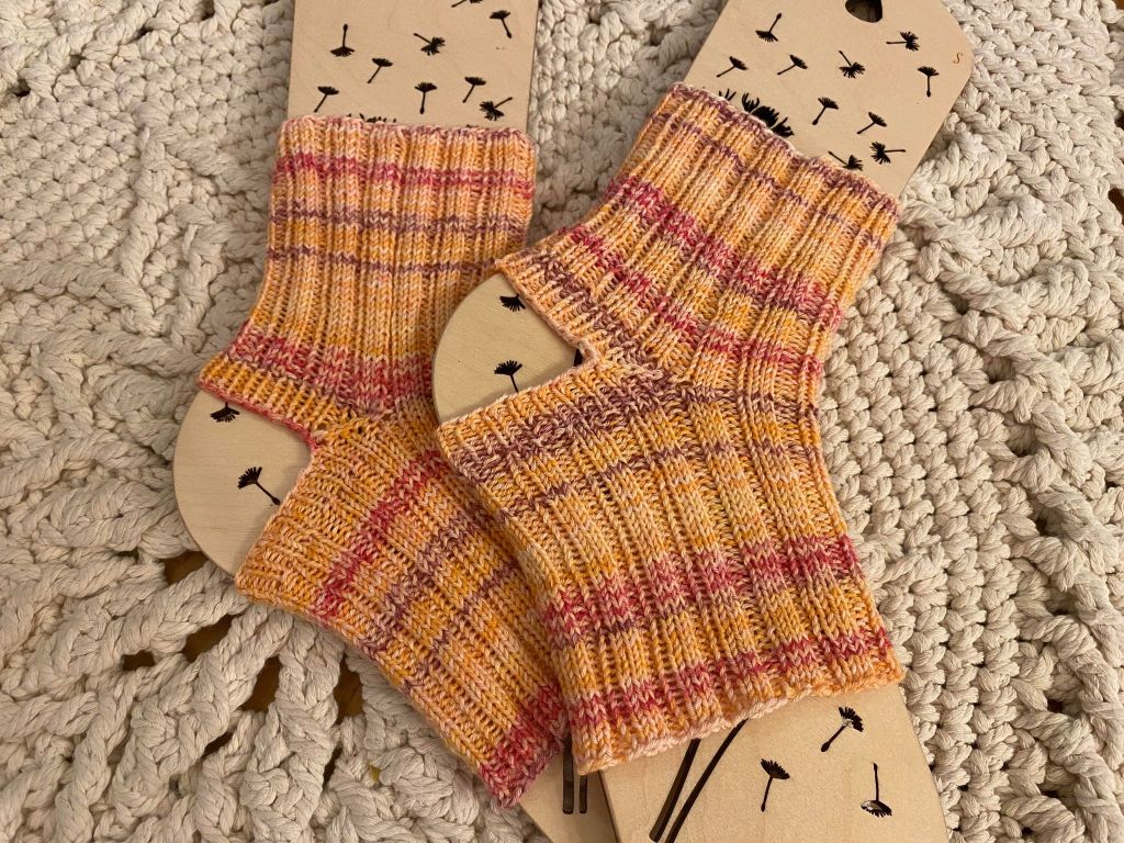 Energiakriisin myötä madalsimme kotimme lämpötilaa talvella muutaman asteen verran, joten opettelin nukkumaan villasukat jalassa. Tapa osoittautui niin mukavaksi, että kesän kolkutellessa ovella aloin pohtimaan millä korvaan villasukat kesällä. Näiden sukkien on siis tarkoitus toimia kesällä unisukkina ja tyyliksi sopi täydellisesti kärjestä ja kantapäästä avoimet yogasukat. Tein koko sukan 3o, 2n joustimena, 65 s, 2,5 mm puikoilla. Kantapään kohdalla neuloin puolet silmukoista ensin apulangalla ja jatkoin sitten sukan loppuun. Lopuksi keräsin apulangan molemmin puolin 32 s ja purin apulangan pois. Neuloin kanta-aukkoon muutamia kerroksia 1o, 1n joustinta ja tein sivuissa joka toisella kerroksella kavennukset. Ajattelin että pieni kantaresori auttaisi sukkaa pysymään paremmin jalassa. Vaikka lanka onkin joustavaa, tuntuu neulos jollain tapaa löysältä, eikä läheskään niin kimmoisalta kuin villa.