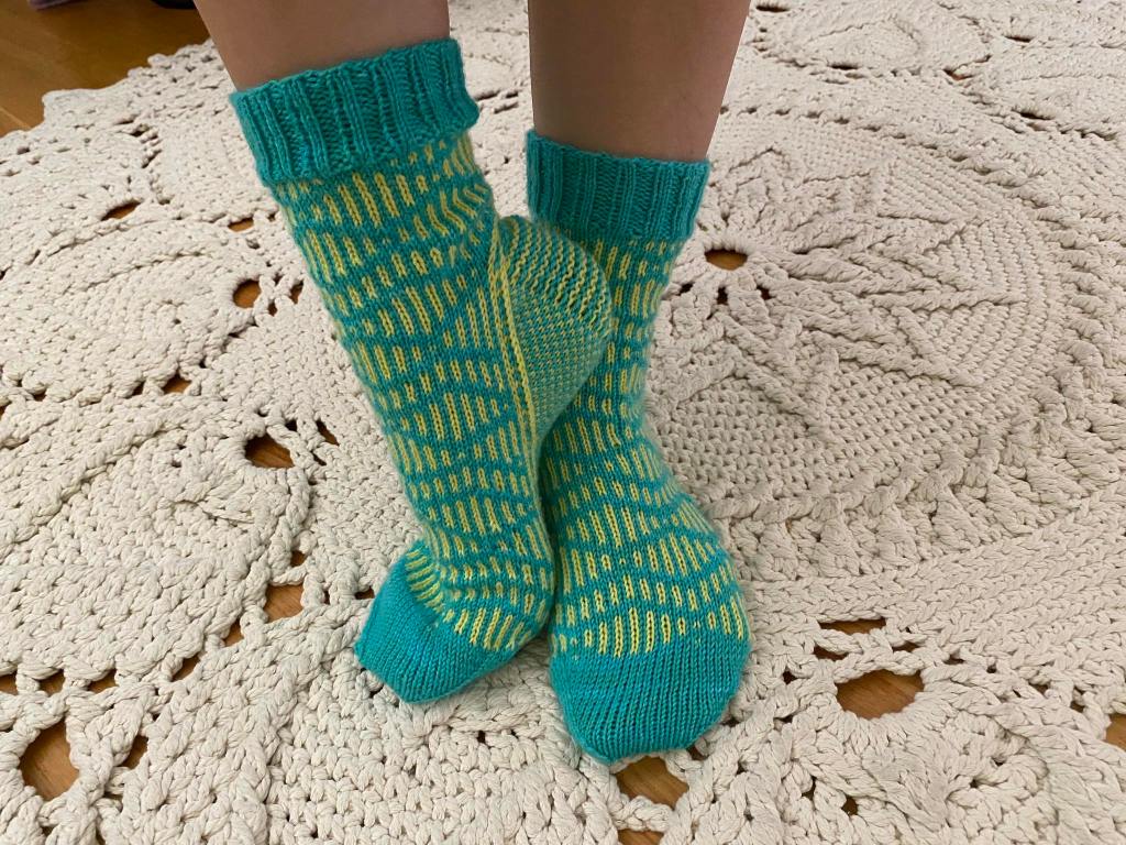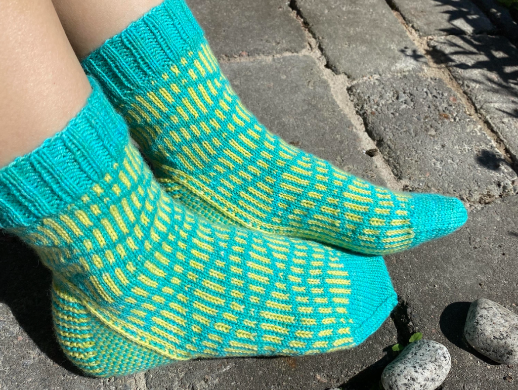 Ä-kirjaimella alkavia ja inspiroivia sanoja ei äkkiseltään tullut mieleen moniakaan. Ääniaalto oli helppo valinta simppelille viivakuviolle. Valitsin sukkiin pirteän turkoosikeltaisen yhdistelmän itse värjättyä sukkamerinoa. Sukkien neulominen vei muutaman viikon, koska innostusta neulomiseen ei juurikaan löytynyt.