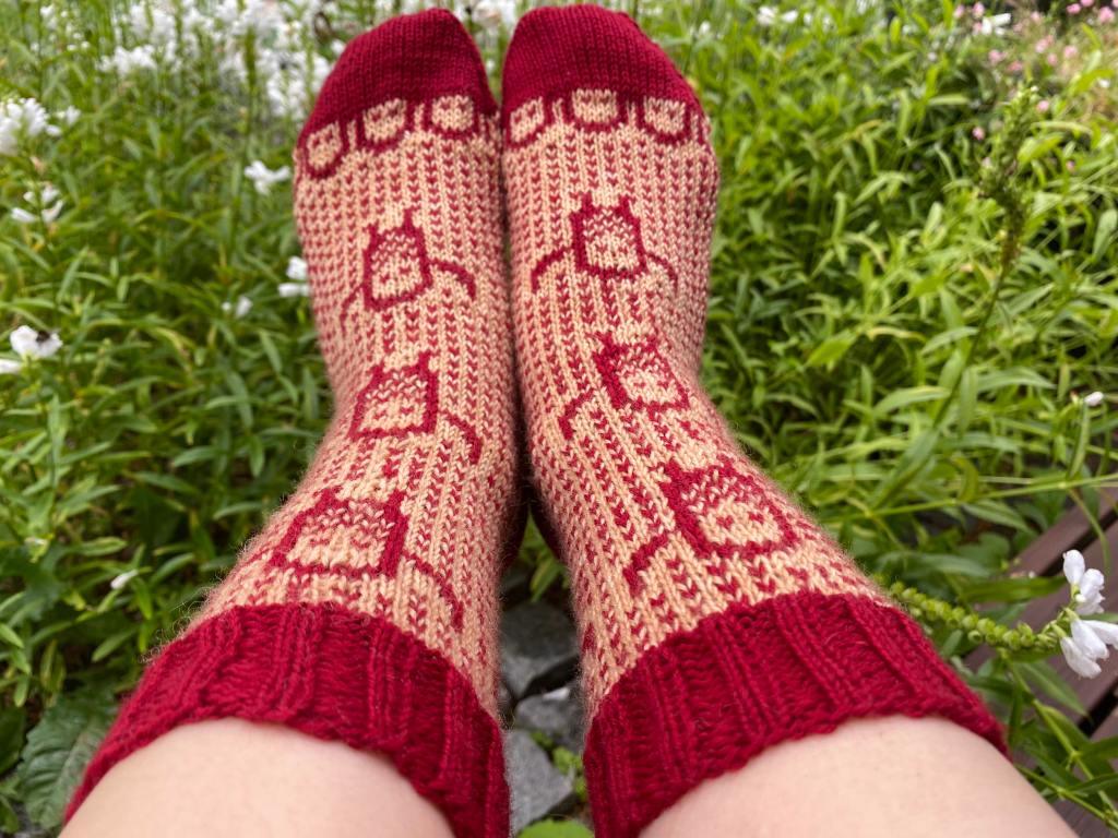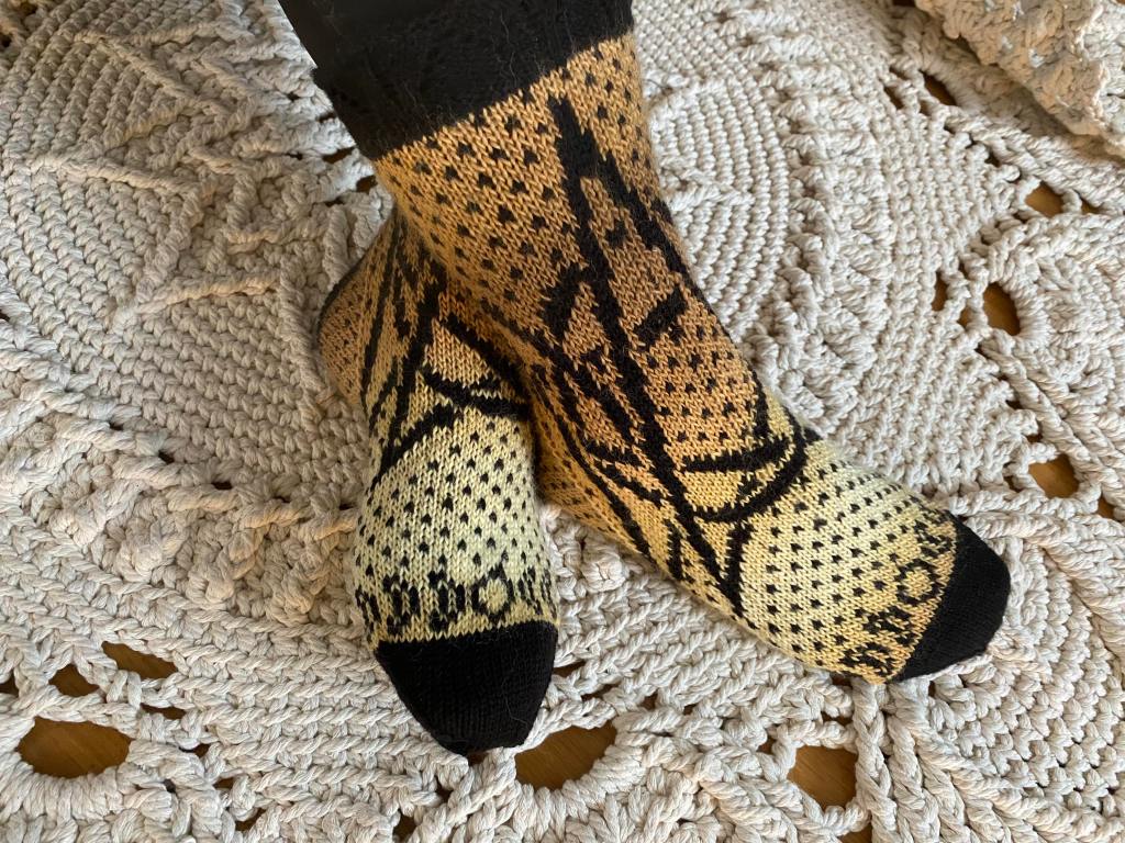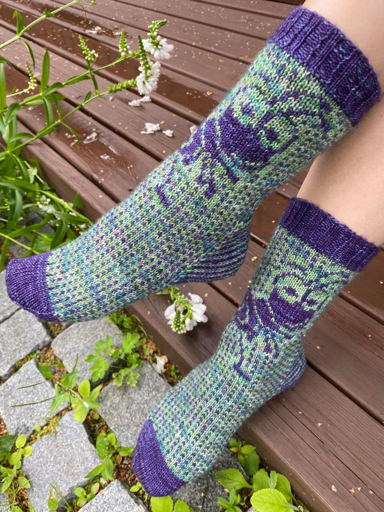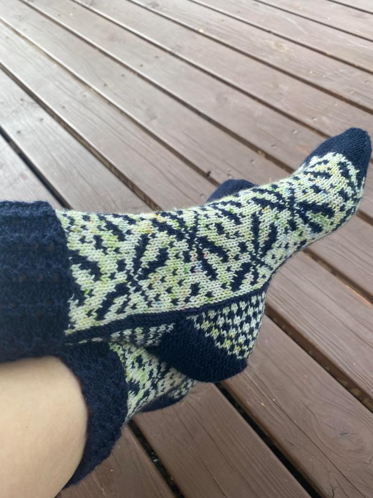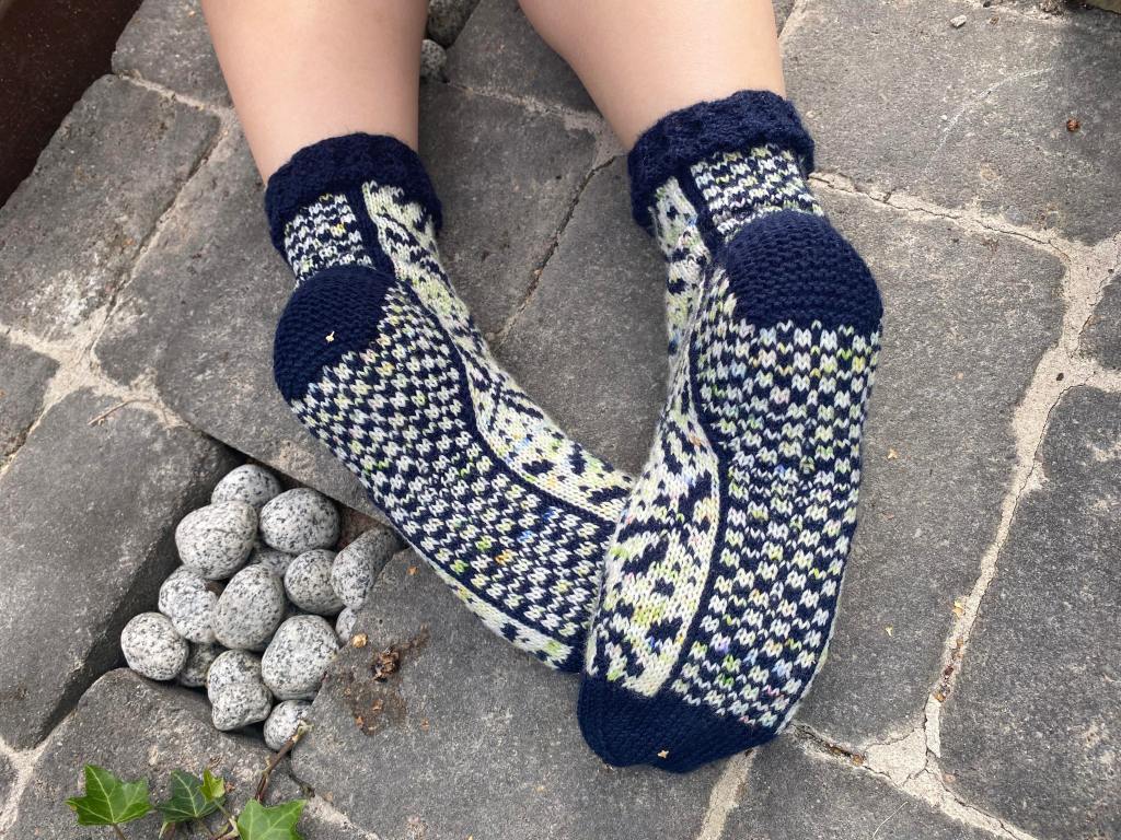Ö-kirjaimeen valitsin sanan ötökkä. Näin heinäkuussa kosteikoissa ja rannoilla näkee paljon hienosti kimaltelevia sudenkorentoja, jotka lentelevät ristiin rastiin surahdellen. Halusin vangita muutaman sudenkorennon ötökkäsukkiin, mutta kaaviota piirrellessä päädyinkin täyttämään sukat sudenkorennoilla. Näistä sukista olin niin innoissani, että piirsin kaavion valmiiksi yhdessä illassa ja aloitin neulomisen heti seuraavana aamuna. Iltaan mennessä ensimmäinen sukka oli kärkeä vaille valmis. Seuraavana päivänä tein kärjen ja seuraavan sukan samaan vaiheeseen. Neljäntenä päivänä sukkapari valmistui.