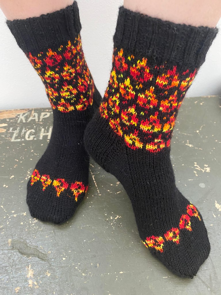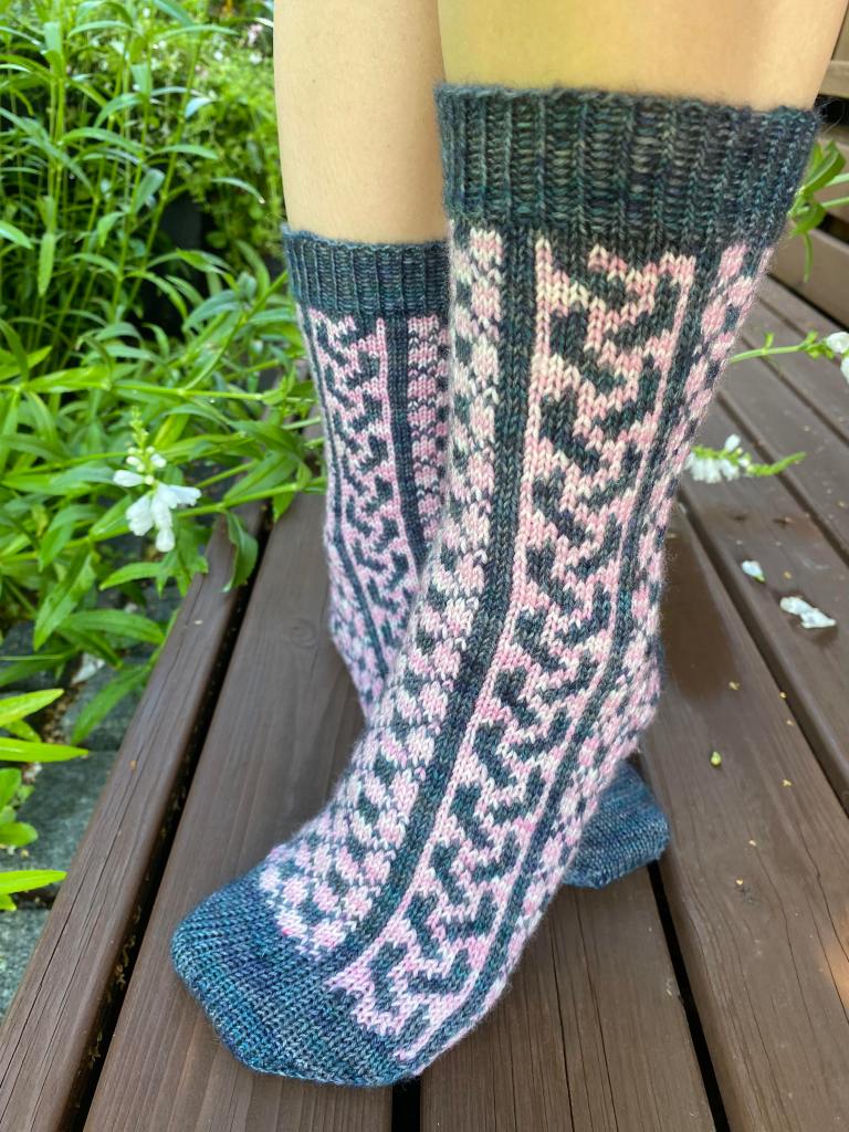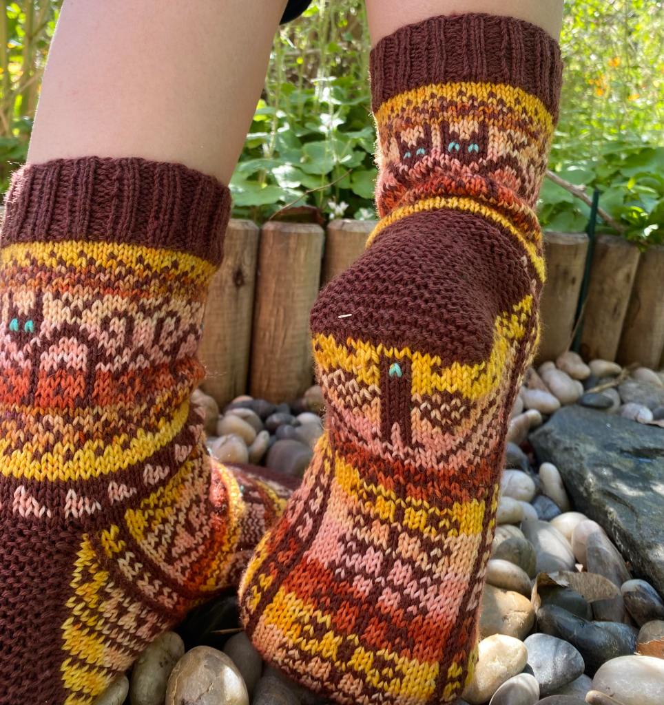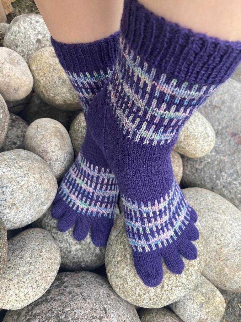 Ö-kirjaimeen valitsin sanan ötökkä. Näin heinäkuussa kosteikoissa ja rannoilla näkee paljon hienosti kimaltelevia sudenkorentoja, jotka lentelevät ristiin rastiin surahdellen. Halusin vangita muutaman sudenkorennon ötökkäsukkiin, mutta kaaviota piirrellessä päädyinkin täyttämään sukat sudenkorennoilla. Näistä sukista olin niin innoissani, että piirsin kaavion valmiiksi yhdessä illassa ja aloitin neulomisen heti seuraavana aamuna. Iltaan mennessä ensimmäinen sukka oli kärkeä vaille valmis. Seuraavana päivänä tein kärjen ja seuraavan sukan samaan vaiheeseen. Neljäntenä päivänä sukkapari valmistui.