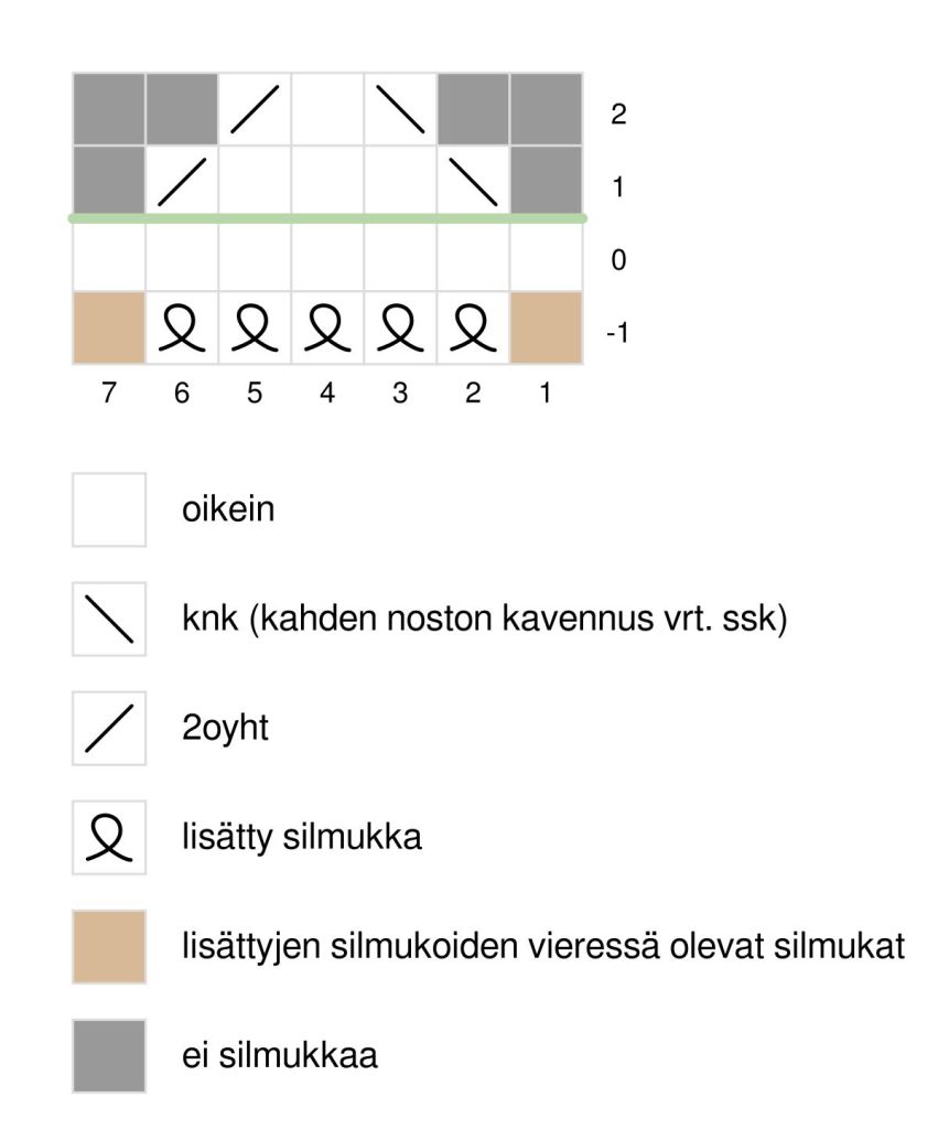Pikkusormi neulotaan kämmenen jatkeeksi, sen jälkeen neulotaan kaksi korotuskerrosta ennen seuraavia sormia. Kaikille sormille tehdään ennen päättelyä kavennuskerros. Vinkkejä siisteihin sormenväleihin voit katsoa täältä. Sormet asettuvat työssä niin, että keskisormen 6 kädenselän puolelta otettavaa silmukkaa asettuvat kuvion keskelle. Voit aloittaa sormen neulomisen ennen tai jälkeen viereisestä sormesta poimittavia silmukoita oman maun mukaan. Luo uudet silmukat sormien väliin silmuillen.