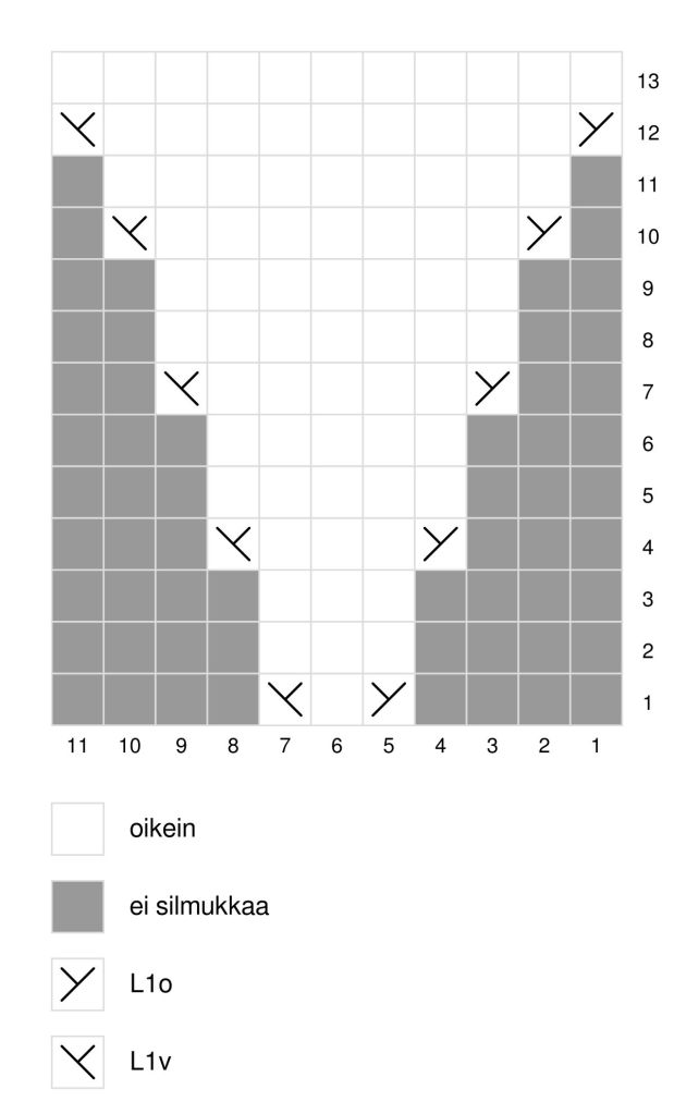 Ota kädenselän puolelta 6 silmukkaa ja kämmenen puolelta 5 silmukkaa sukkapuikoille, nosta nimettömän sivusta 1s ja luo etusormen sivulle 1s. Jatka 13 silmukalla sileää oikeaa kunnes työ ulottuu keskisormen päähän, tee kavennuskerros.