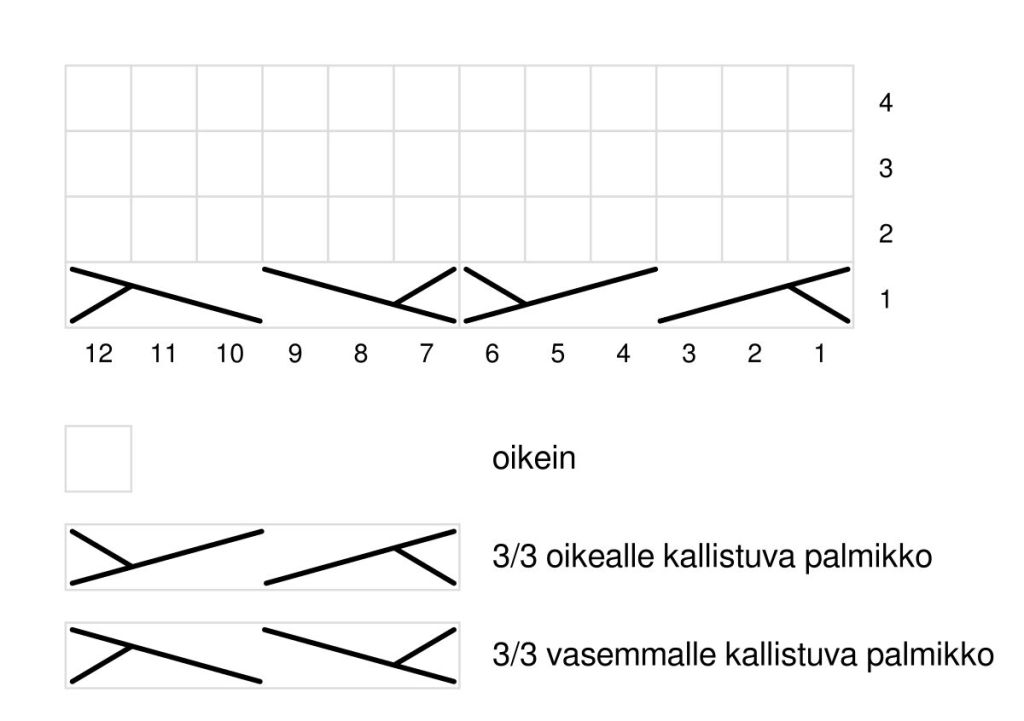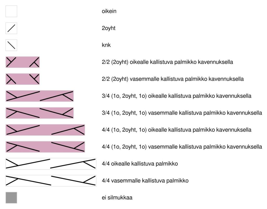 Palmikoiden kavennukset. Tehdessäsi palmikkoa tee taakse jäävillä silmukoilla yksi 2oyht kavennus. Esim. 4/4 oikealle kallistuva palmikko kavennuksella neulotaan seuraavasti: Siirrä neljä silmukkaa apupuikolle työn taakse, neulo 4 silmukkaa vasemmalta puikolta, siirrä apupuikon silmukat takaisin vasemmalle puikolle ja neulo 1o, 2oyht, 1o. Yksi silmukka kavennettu. Palmikot, joissa tehdään samalla kavennus on merkitty kaavioon punaisella.