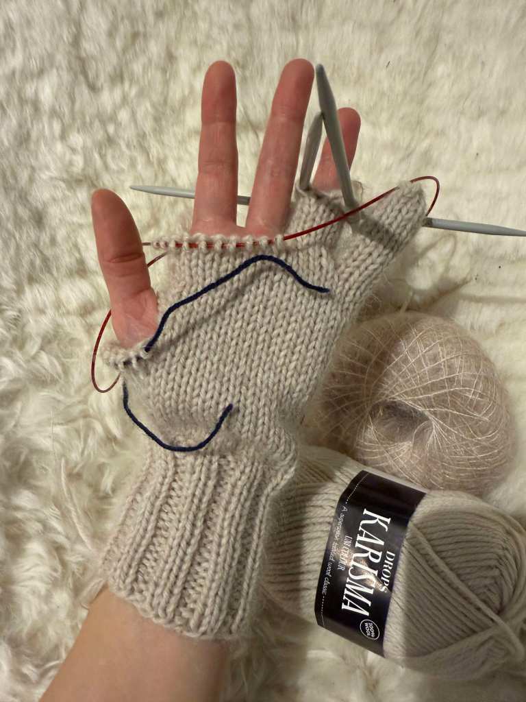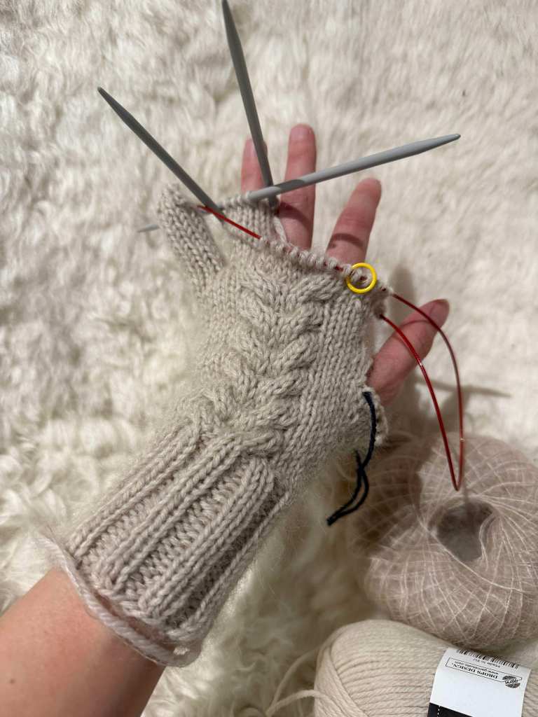 Neulo kädenselän silmukat ja siirrä kämmenen puolelta 6 silmukkaa ja 2s kädenselän puolelta, luo 2 silmukkaa nimettömän sivulle. Jatka suljettuna neuleena 10 silmukalla kunnes työ ulottuu pikkurillin päähän, neulo kavennuskerros.
