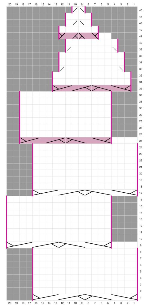 Huomaa että kuvion mallikerta siirtyy kerroksella 9 neljä silmukkaa eteenpäin, ja palaa samat neljä silmukkaa takaisinpäin kerroksella 17. Kuvio siirtyy jälleen neljä silmukkaa eteenpäin kerroksella 25 ja palaa kolme silmukkaa taaksepäin kerroksella 33. Kerroksella 44 kuvio siirtyy kaksi silmukkaa eteenpäin.