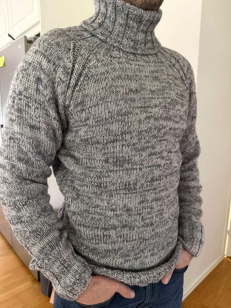 Kokoa valitessani arvoin kahden koon väliltä, päädyin M kokoon, pidensin hihoja hieman ohjeen mitoituksesta, muuten paita on neulottu ohjeen mukaisesti. 3×3 joustinraidat kyljissä ja hihojen alla tekevät paidasta melko istuvan. Kaula-aukko on hieman erikoinen ja resori alkaa melko matalalta. Vaikka malli ei tunnu olevan ihan viimeiseen asti istuvaksi hiottu, kelpaa paita arkikäyttöön varsin hyvin. Sovituksissa hihat vaikuttivat pidennyksestä huolimatta vähän lyhyehköiltä, mutta luotin siihen, että neulos venähtää loppuviimeistelyssä. Ja totta tosiaan, neulos tuntui venähtävän aivan valtavasti, mutta tasokuivauksen jälkeen paita juuri hyvän kokoinen ja sekä helman, että hihojen pituudet olivat juuri hyvät. Ehdin napata yhden kuvan paidasta ennen kuin se pääsi käyttöön.