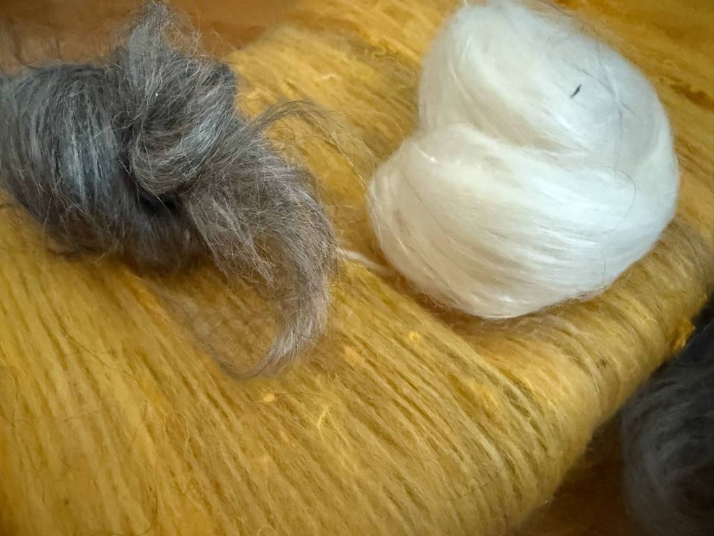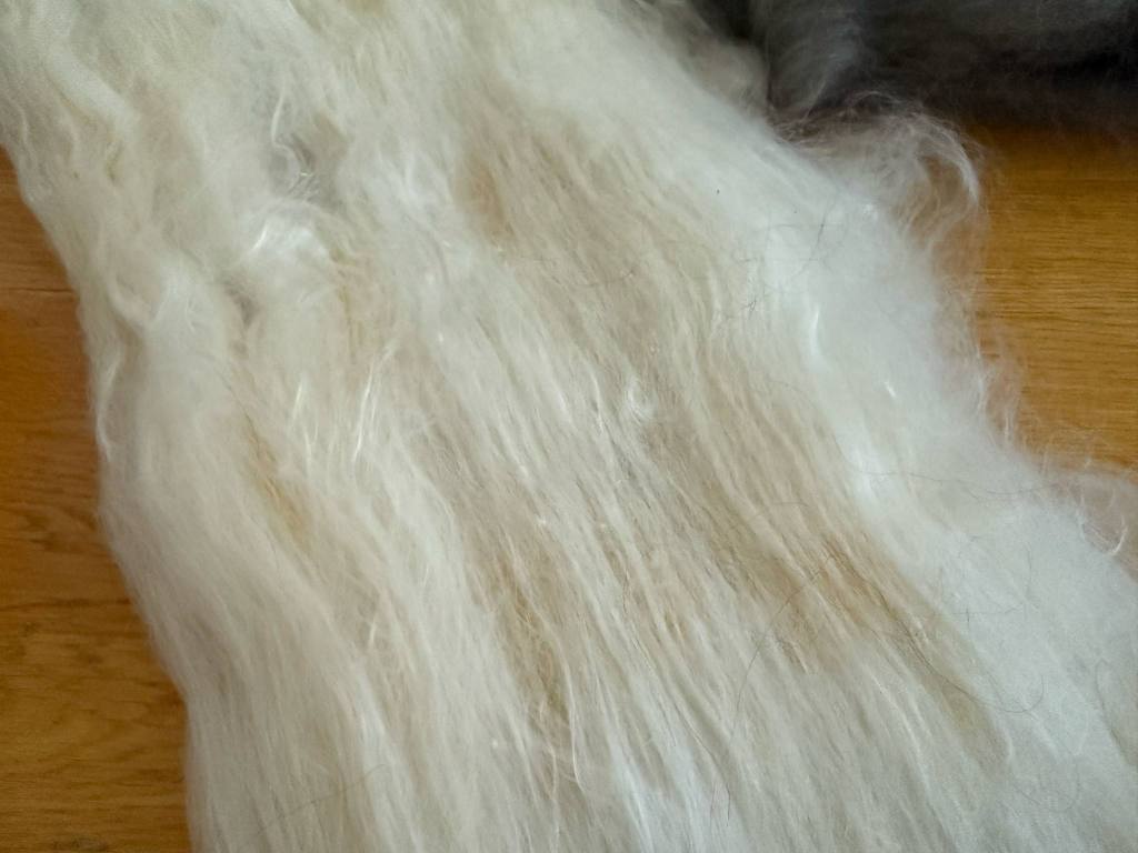 Valkoinen kehräytyi aika mukavasti, joskin kuitusekoitus oli melko liukasta ja vaihtelevan mittaista, harmaat ja keltaiset kuidut sekoittuivat lankaan kivasti.