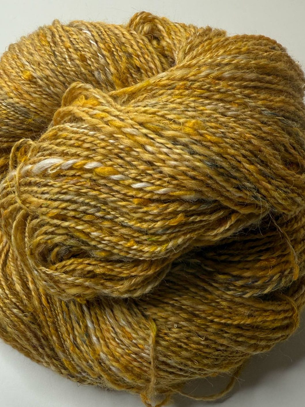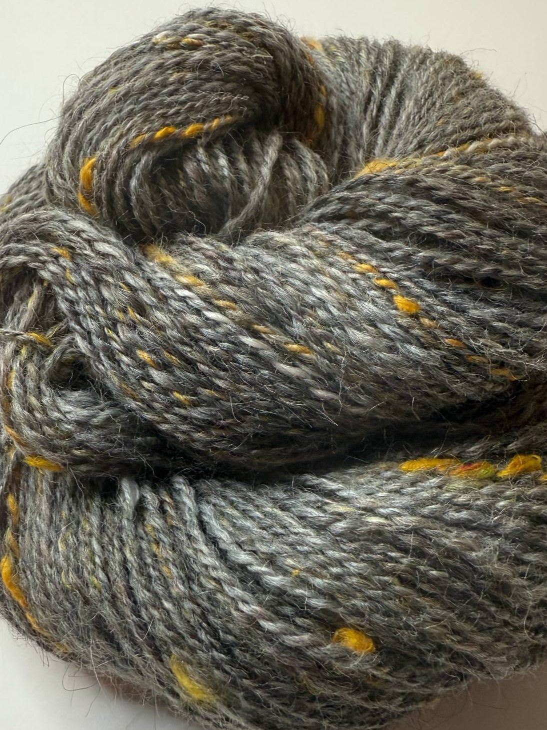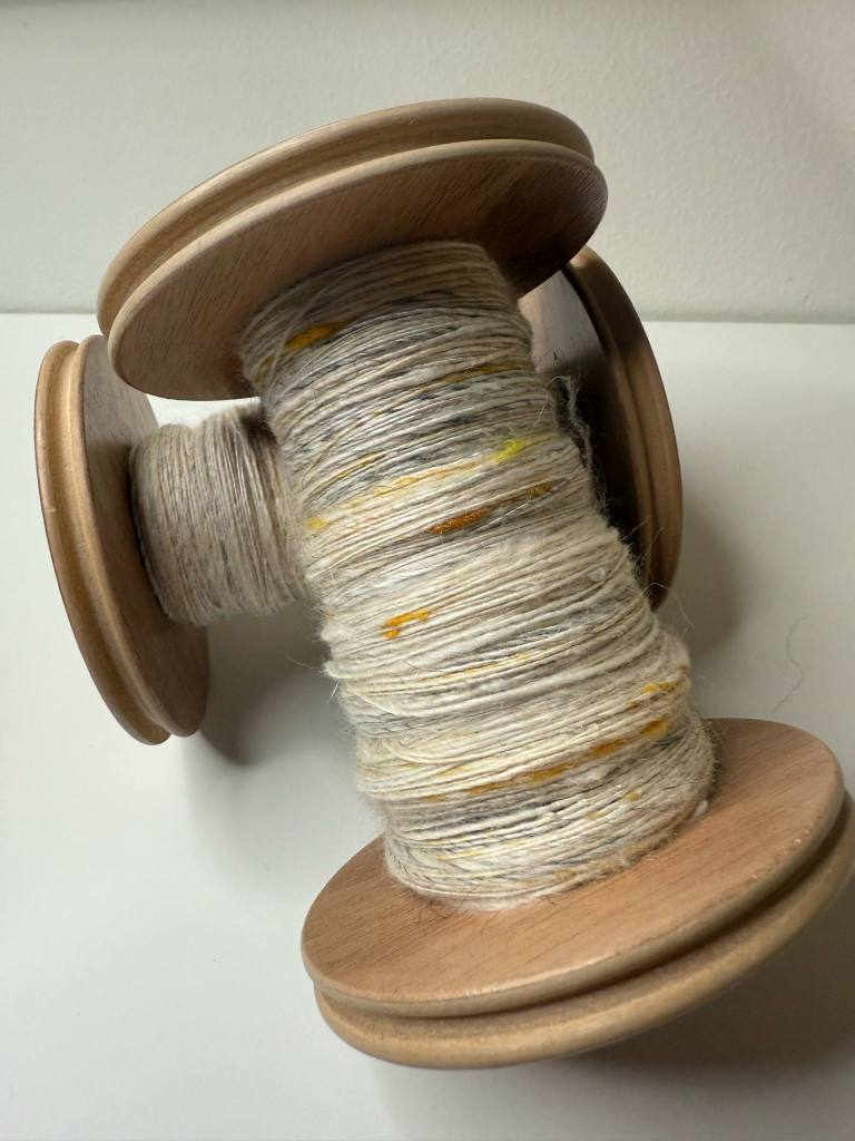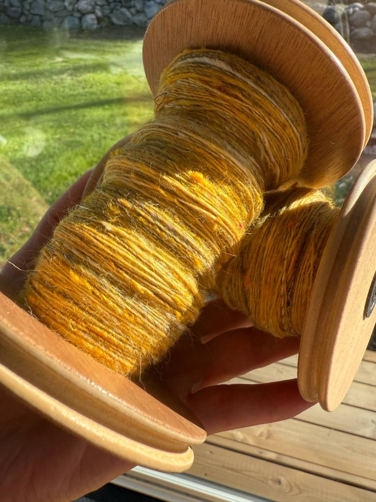 Keltainen seos kehräytyi näistä kolmesta helpoiten, vaikka seassa oli silkkiklönttejä. Harmaan villan kanssa sekoilu oli sen verran työlästä, että päätin karstata suoraan harmaat ja valkoiset keltaisen sekaan. Myllytin setin uudestaan karstamyllyllä ja kehräsin puoliskot omille rullilleen. Harmaa tasoittui ehkä liiankin hyvin keltaiseen, mutta lopputulos on silti selkeästi keltainen, jossa on harmaata siellä täällä. Valkoinen on melko huomaamaton osapuoli tässä yksilössä. Aurinkoista keltaista oli mukava kehrätä aurinkoisessa säässä.