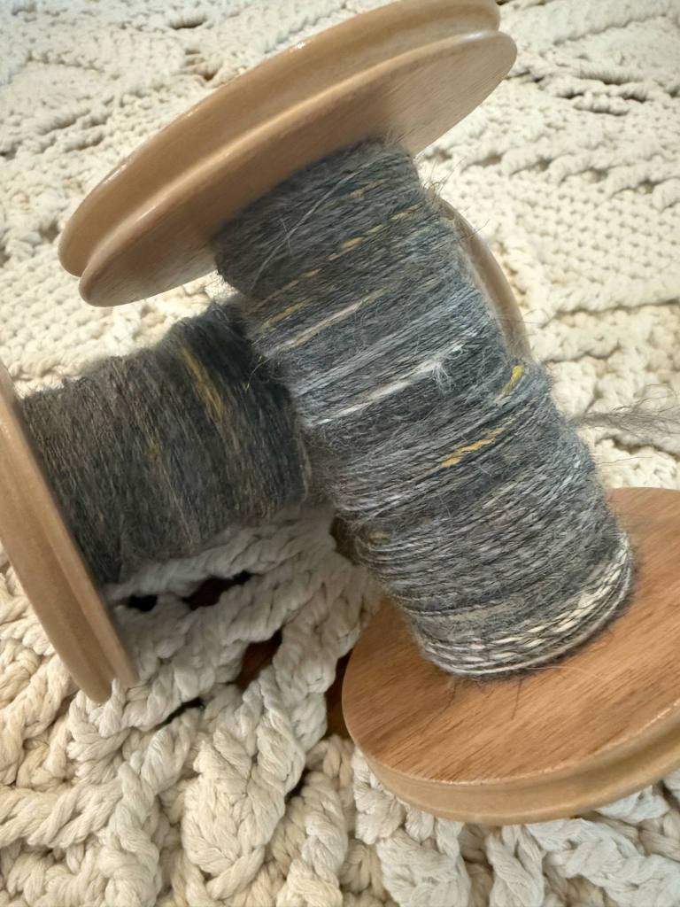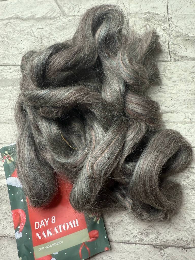 Harmaaseen vyyhtiin otin vuoden 2024 luukun 8 harmaan topsin, joka oli gotland & bamboo sekoitusta. Todella liukasta ja lähes mahdotonta saada karstamyllyllä kuriin ja järjestykseen. Tämän kaveriksi laitoin 50 g harmaata corriedalea.