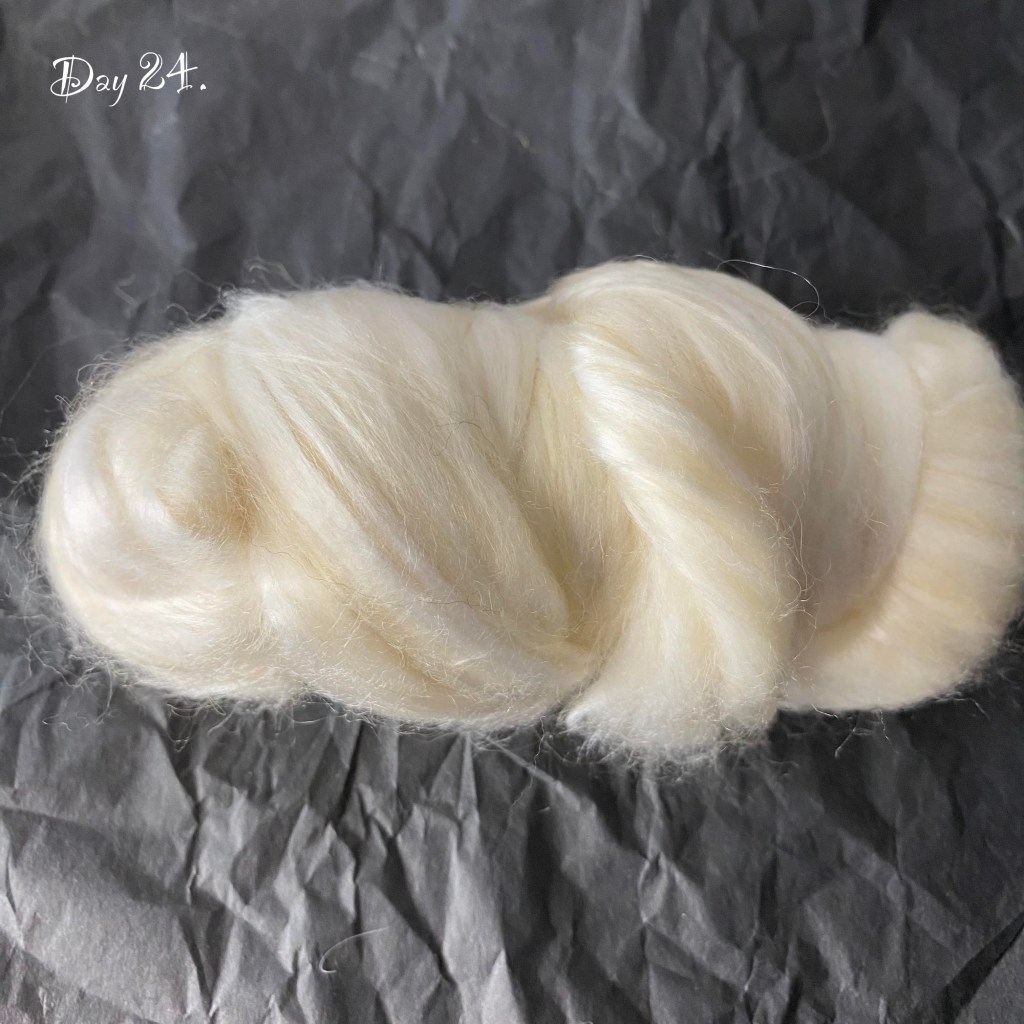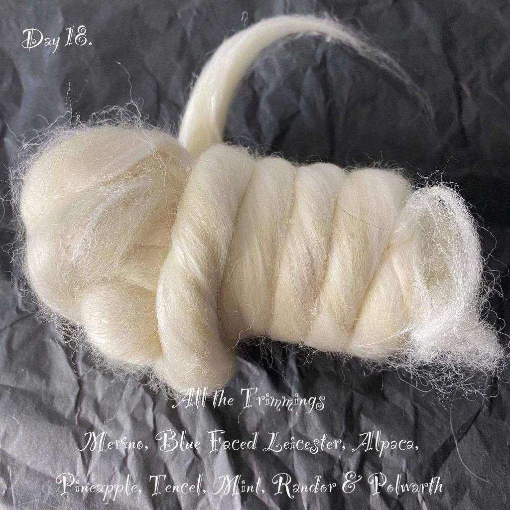 Varasin 3 x 100 g vyyhdin kokonaisuuteen 4 kalenteritopsia ja 50 g harmaata ja 50 g keltaista corriedalea. Kalenteritopseista kaksi valkoista on vuodelta 2022, päivät 18 ja 24 ja pitävät sisällään: sekä merino, BFL, alpaca, ananas, tencel, mint, randor ja polwarth sekä ultra fine merino, casmere, mulberry silk ja rose fiber. Näiden sekoitteiden yhdistäminen karstamyllyllä oli melko vaivatonta verrattuna harmaaseen vyyhtiin. Ajatuksena oli ottaa kaikkiin vyyhteihin pääväriksi yksi väri ja lisätä kahta muuta täpliksi sekaan