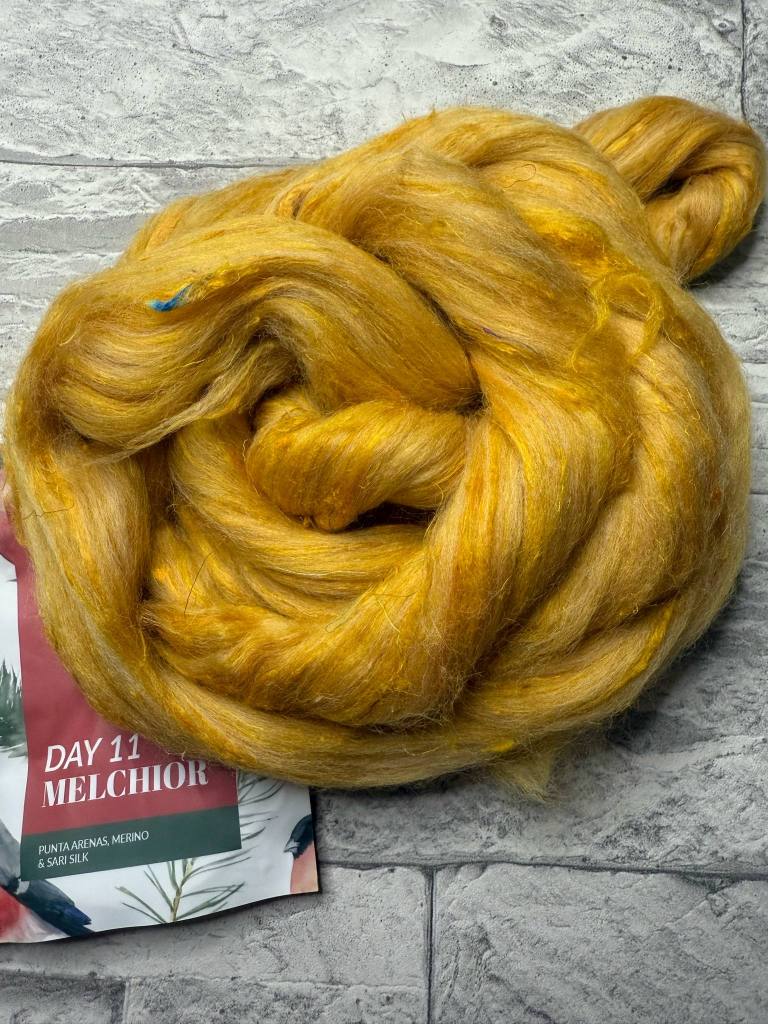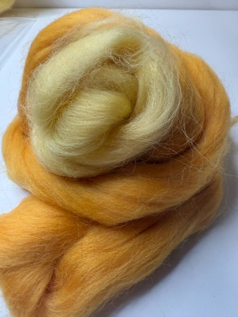 Keltaista lankaa varten otin vuoden 2024 kalenterista luukun 11 punta arenas, merino ja sari silkkisekoitteen. Loput 50 g punnitsin kahta eri sävyistä keltaista corriedalea. Keltaisten karstaus meni melko vaivattomasti, jos silkkiknöllejä ei lasketa.