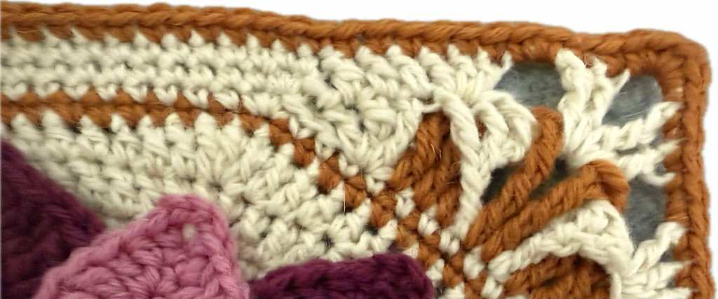 Kulmien koristelu tummalla sinapilla. Koristelu tehdään osin kerroksen 1 takana ja osin edessä. Voit korvata ensimmäisen itsenäisesti aloitetun pp:n neljällä ketjusilmukalla halutessasi. Huomaa että 3pp → tee kolme pp, kun taas pp3 → tehdään pitkä pylväs kolmella langankierrolla.