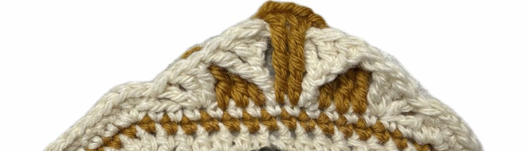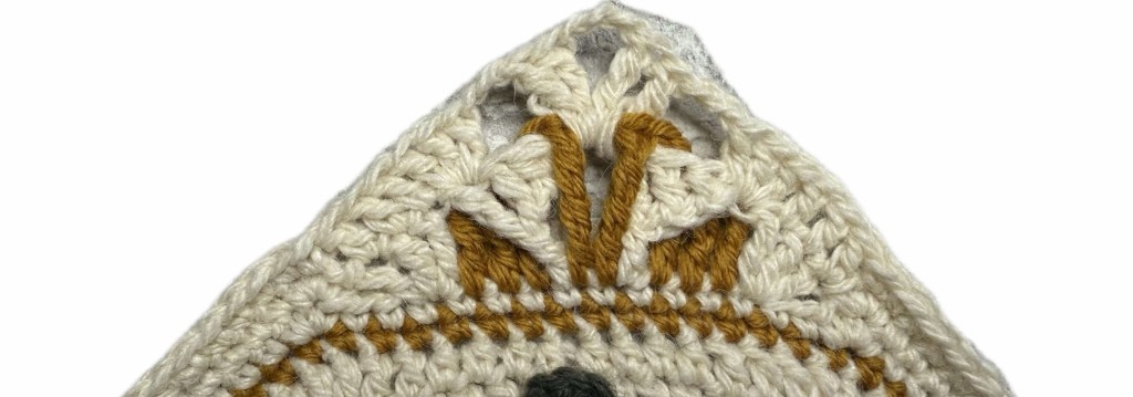 Aloita mistä tahansa kulmaviisteen jälkeisestä kulmasilmukasta. Kolmioon tehtävät ks:t jakautuvat 9s keskisilmukan molemmin puolin. Kun koko kerros on virkattu luonnonvalkoisella, koristellaan jokainen kulma erikseen tummalla sinapilla. Jos joudut poimimaan yksittäisiä silmukoita enemmä/vähemmän, voit tasata ne kerroksella 5 kuvioon sopivaksi. Kulman viistoon osaan tuleva osuus merkitty toistoon tummennettuna.