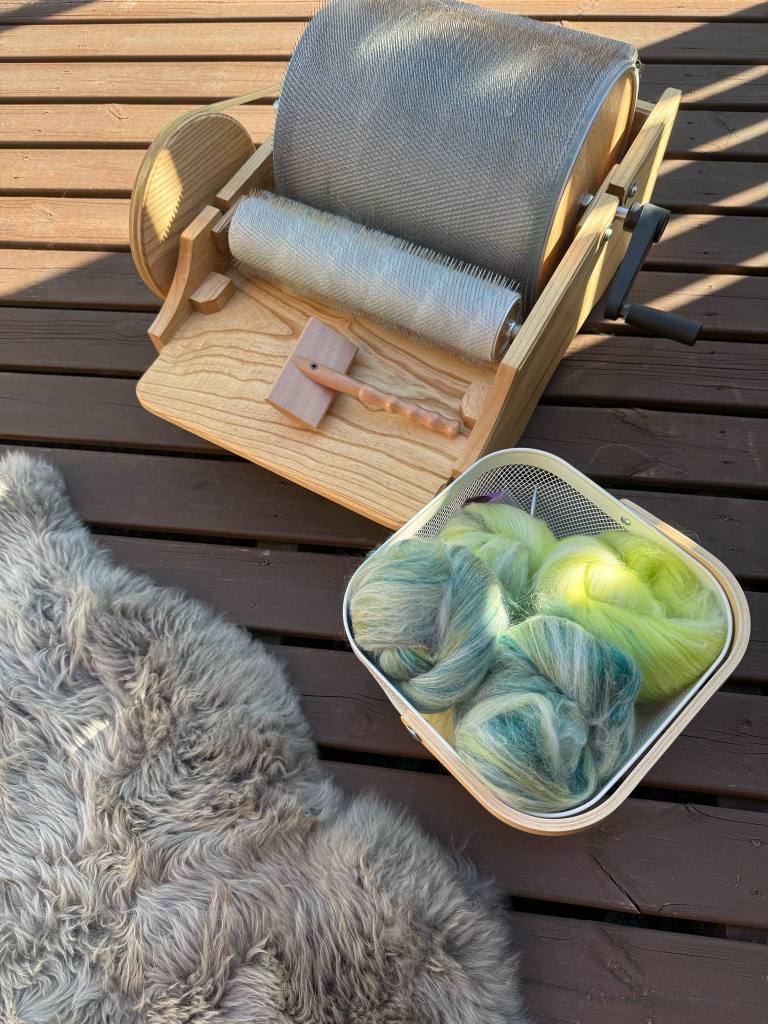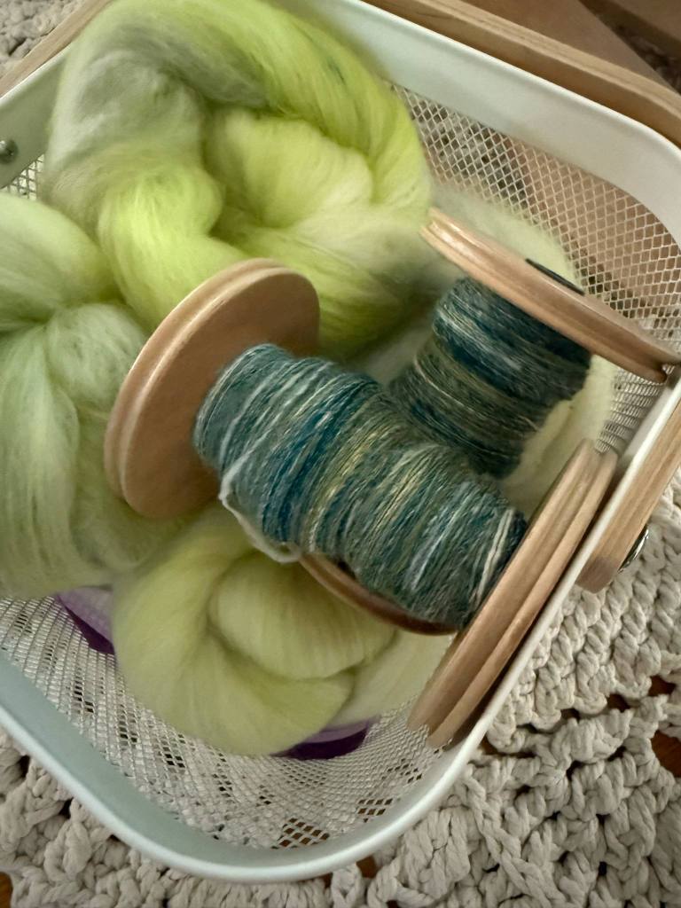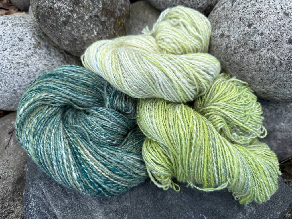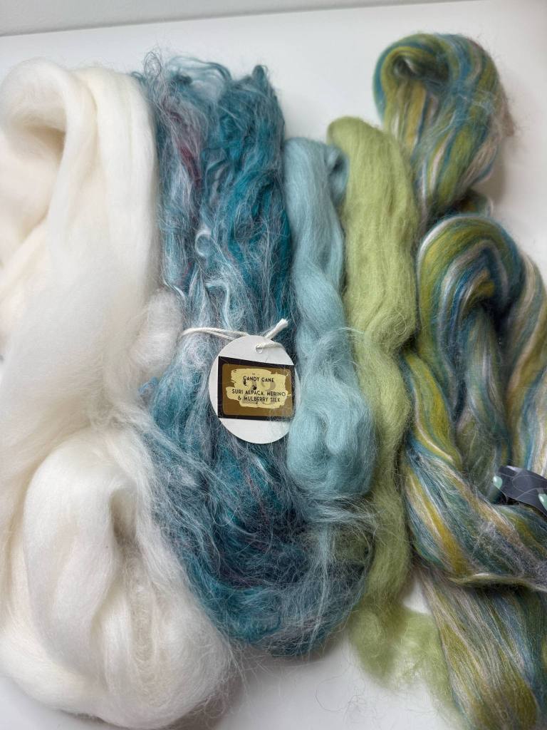 Tähän settiin upotin vuoden 2022 luukun 23 vihreää silkkialpakkaa, joka oli todella liukasta ja pölisevää. Olin jo aiemmin nyppinyt topsista punaiset kuidut johonkin toiseen lankaprojektiin ja halusin päästä eroon tästä pölisevästä pallerosta. Valitsin sen kaveriksi vuoden 2024 ekstrapussukan topsin, jossa oli erilaisia vihreän sävyjä. Näiden lisäksi otin valkoista topsia, joka on ehkä falklandia ja siniharmaata, vihreää ja limenvihreää corriedalea. En punninnut määriä erikseen vaan keräsin kolme 100 g kasaa.