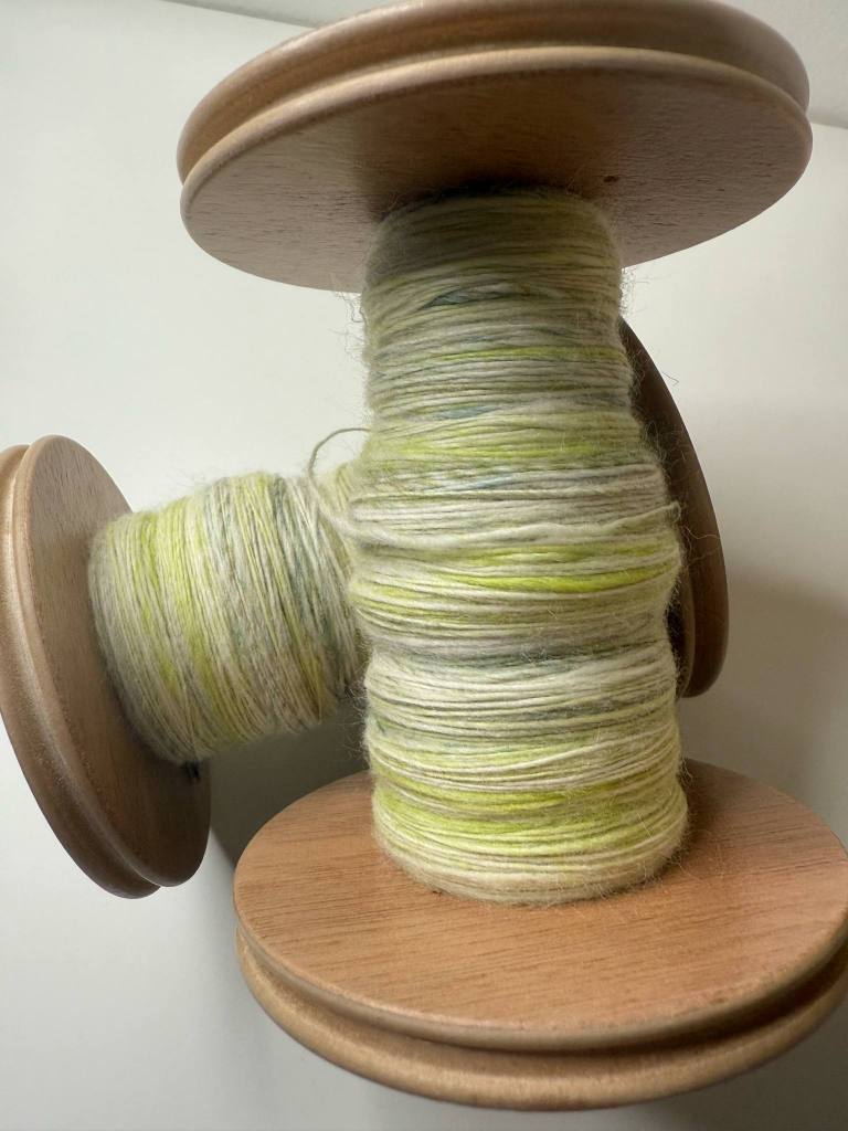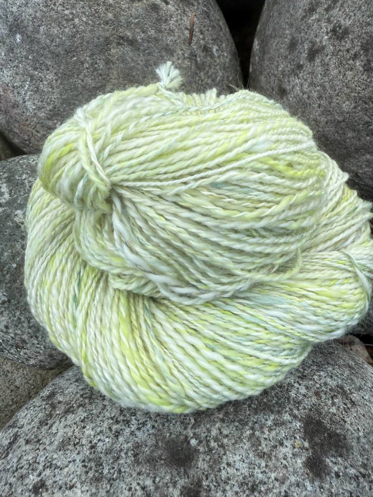 Seuraavaksi kehräsin vaaleimman seoksen. Karstattu seos näytti todella valkeavoittoiselta, mutta yllätyin jälleen kuinka vähäinen määrä värillistä villaa saa langasta eläväisen ja kauniin. Tähän olisi saanut tulla hivenen enemmän kierrettä kertauksessa, sillä vyyhti oli täysin suora jo ennen kastelua. Räikeä lime rauhoittui valkoisen sekaan kivasti.