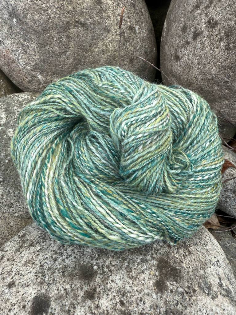 Ensimmäisenä työn alle pääsi tummin seos, koska se sisälsi pelättyä tumman vihreää kuitua. Kehräsin seoksen viikon aikana lyhyissä pätkissä. Tuntumaan tottui ja sen kanssa tuli toimeen, mutta kehrääminen oli kaukana helposta. Valmis lanka on melko kirjavaa vihreää. Tässä kohtaa tajusin, että kahteen muuhun olisi pitänyt laittaa myös tätä pelättyä tummaa vihreää, jotta setistä olisi tullut yhteneväisempi. Tumman vihreä on hyvin hallitsevana valmiissa langassa.