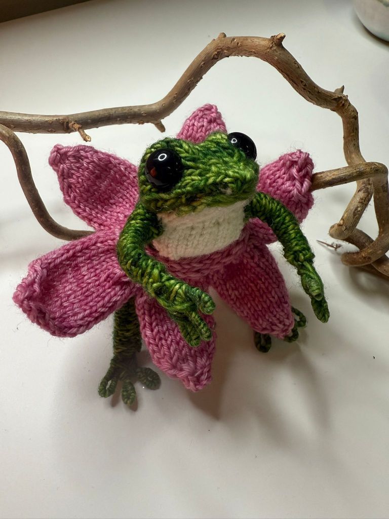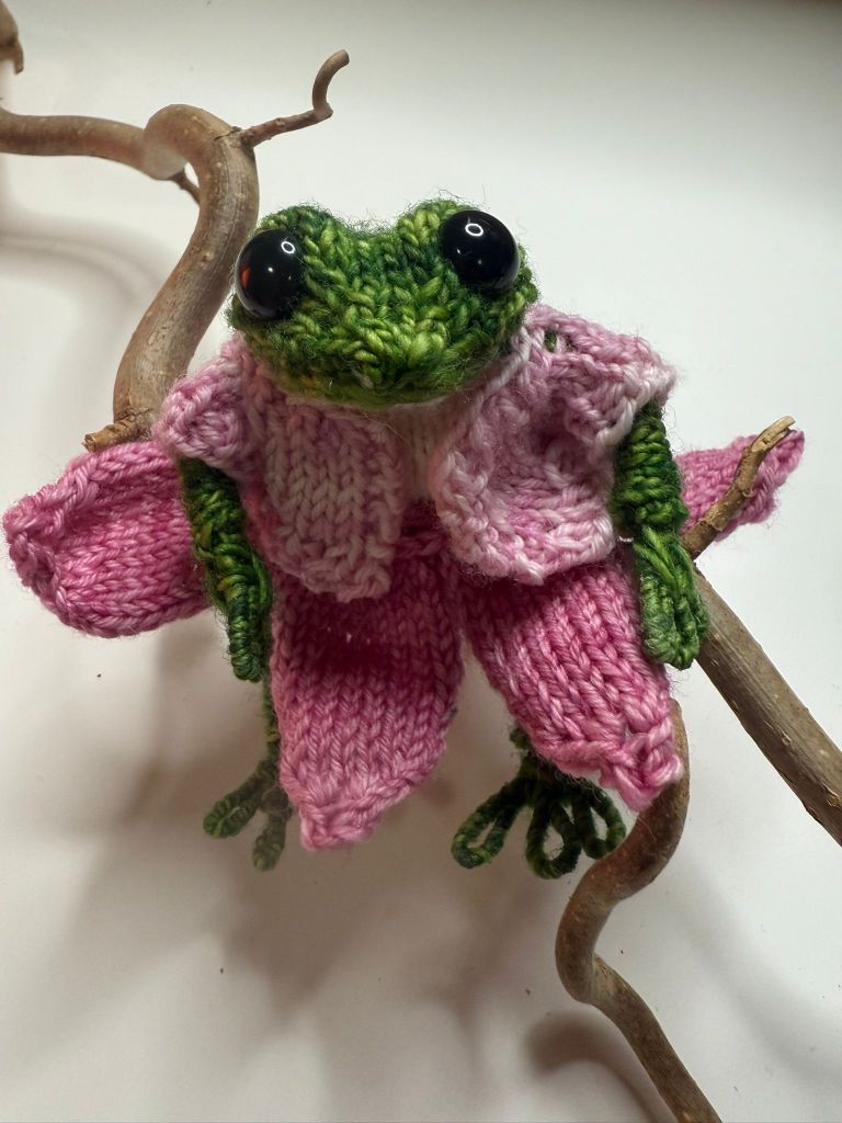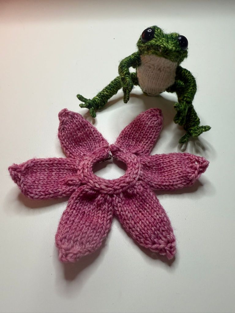 Kyllähän pienellä prinsessasammakolla pitää olla terälehdistä tehty hame. Käytin hameeseen saman vahvuista lankaa kuin itse sammakkoon ja puikkokokokin oli sama.