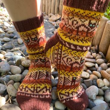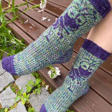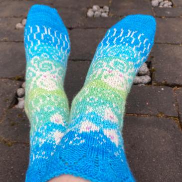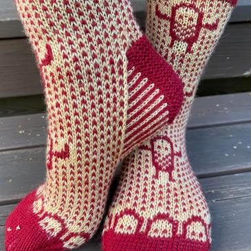Oudot otukset muistuttavat pieniä lepakoita tai prinssinnakkeja siivillä. Näihinkin sukkiin kului tuskaisen monta päivää pelkästään sanan valitsemiseen. Lopulta päätin ottaa kaksi sanaa. Lankana on punainen Unicorn Solid ja sen kaveriksi seitikkivärjättyä mummokalsarin väristä Fabelia. En yleisesti ottaen pidä Fabelista kirjoneuleessa, mutta Unicornin kanssa jäljestä tuli varsin siedettävää. Sukkien kärkiin tuli rivi otuksia kurkkimaan, mutta sukkien … More Outo otus sukat (otuksen kaavio)